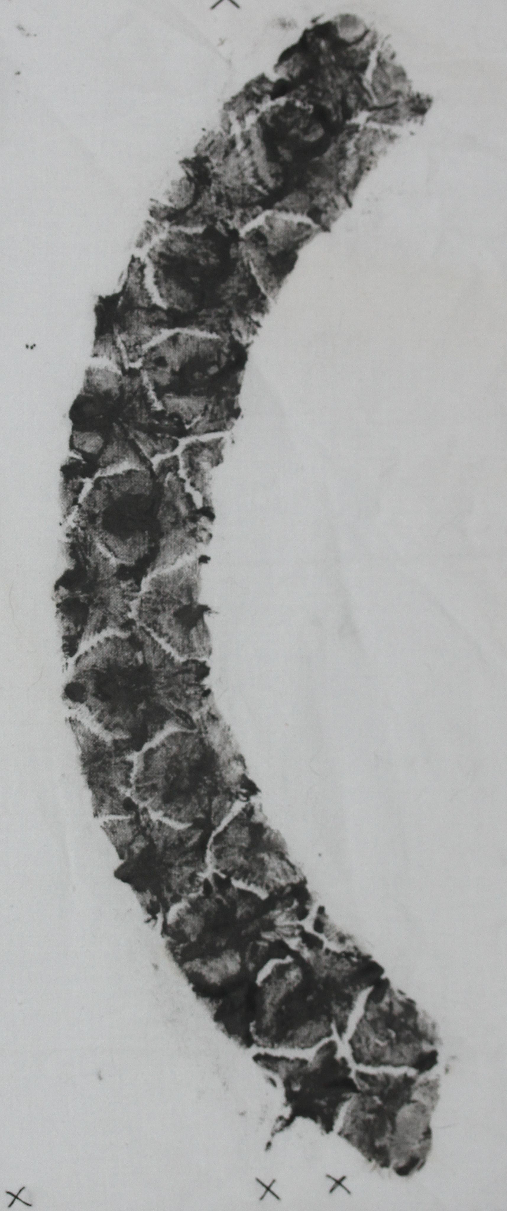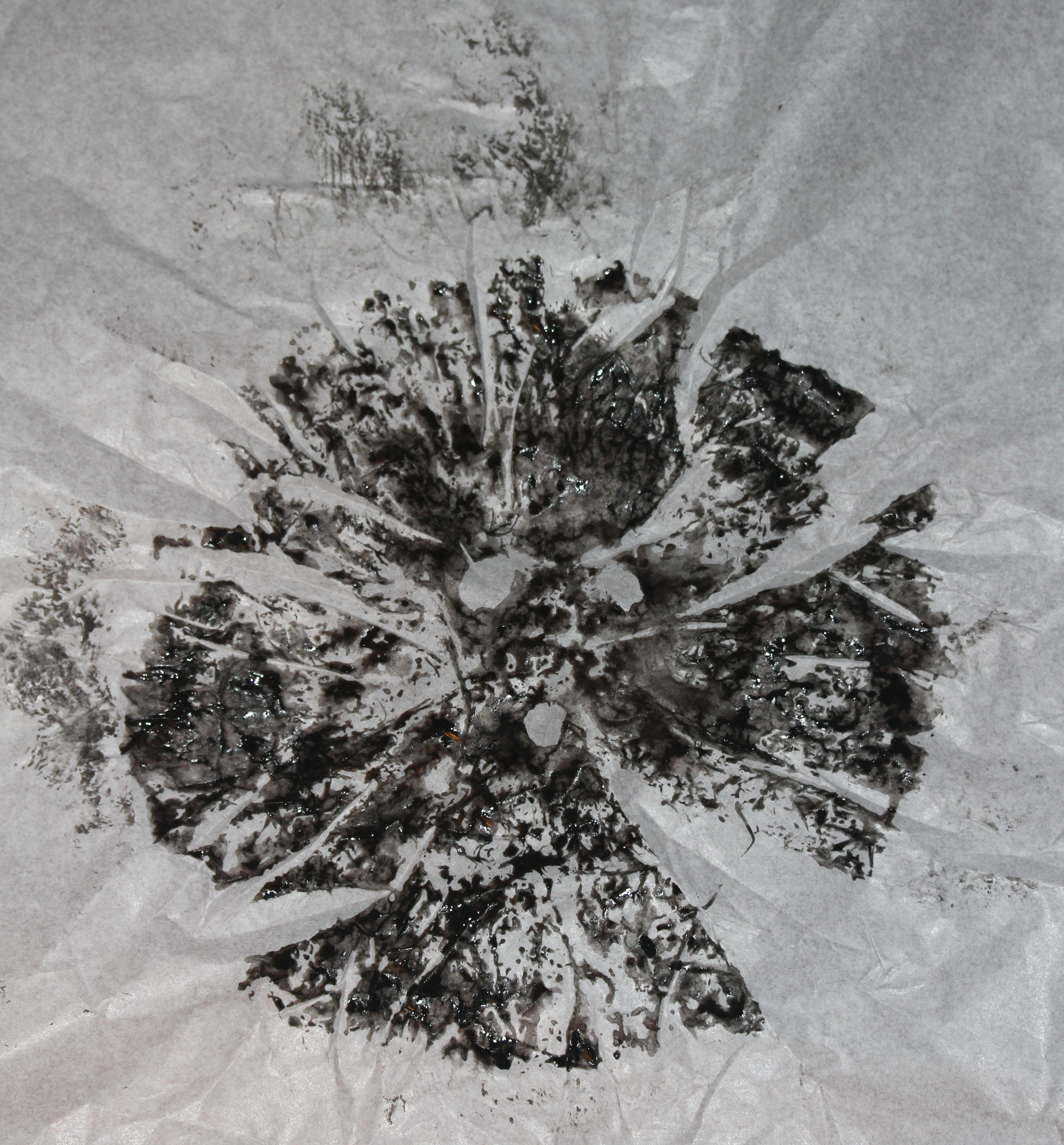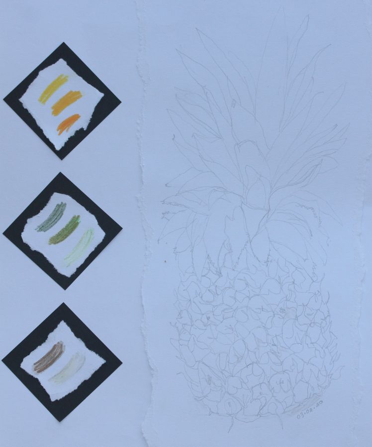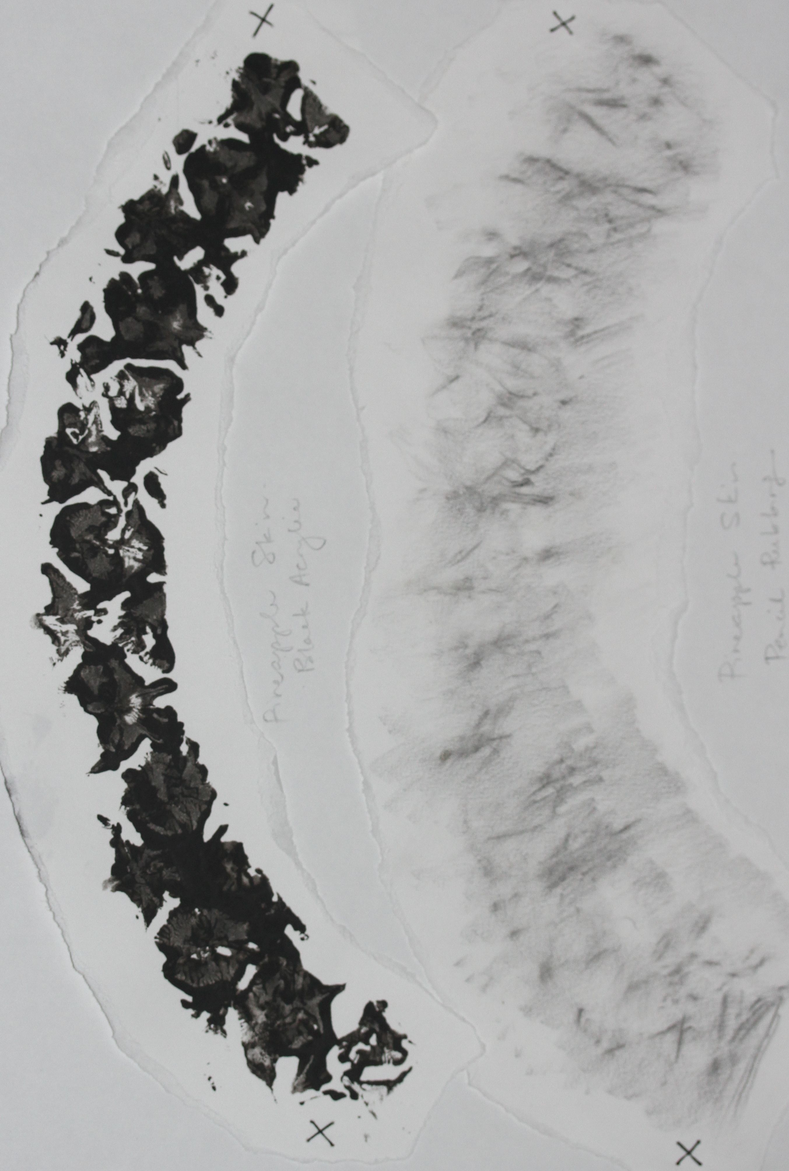 My initial response to the pineapple was visceral and tactile. Rather than draw it, I did some printing with a pineapple skin. I wanted to capture the 3-D nature of it.