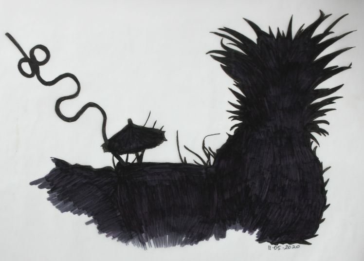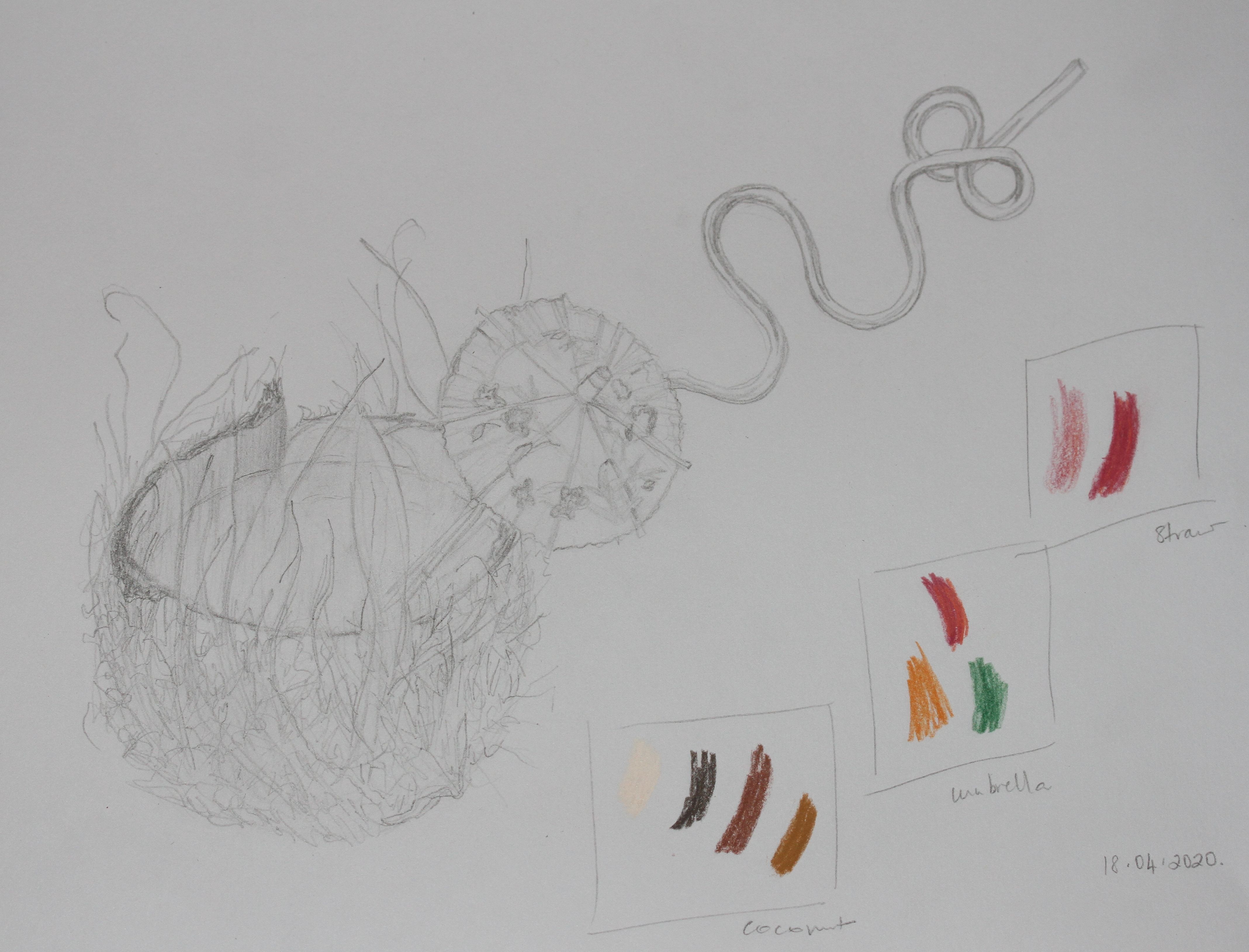 Lots of varying textures here. The ultra-smooth straw, the rumply soft paper and the hairy coconut. Used ‘agitated’ movements, holding the tip of the pencil for the coconut.