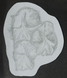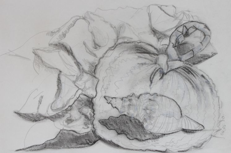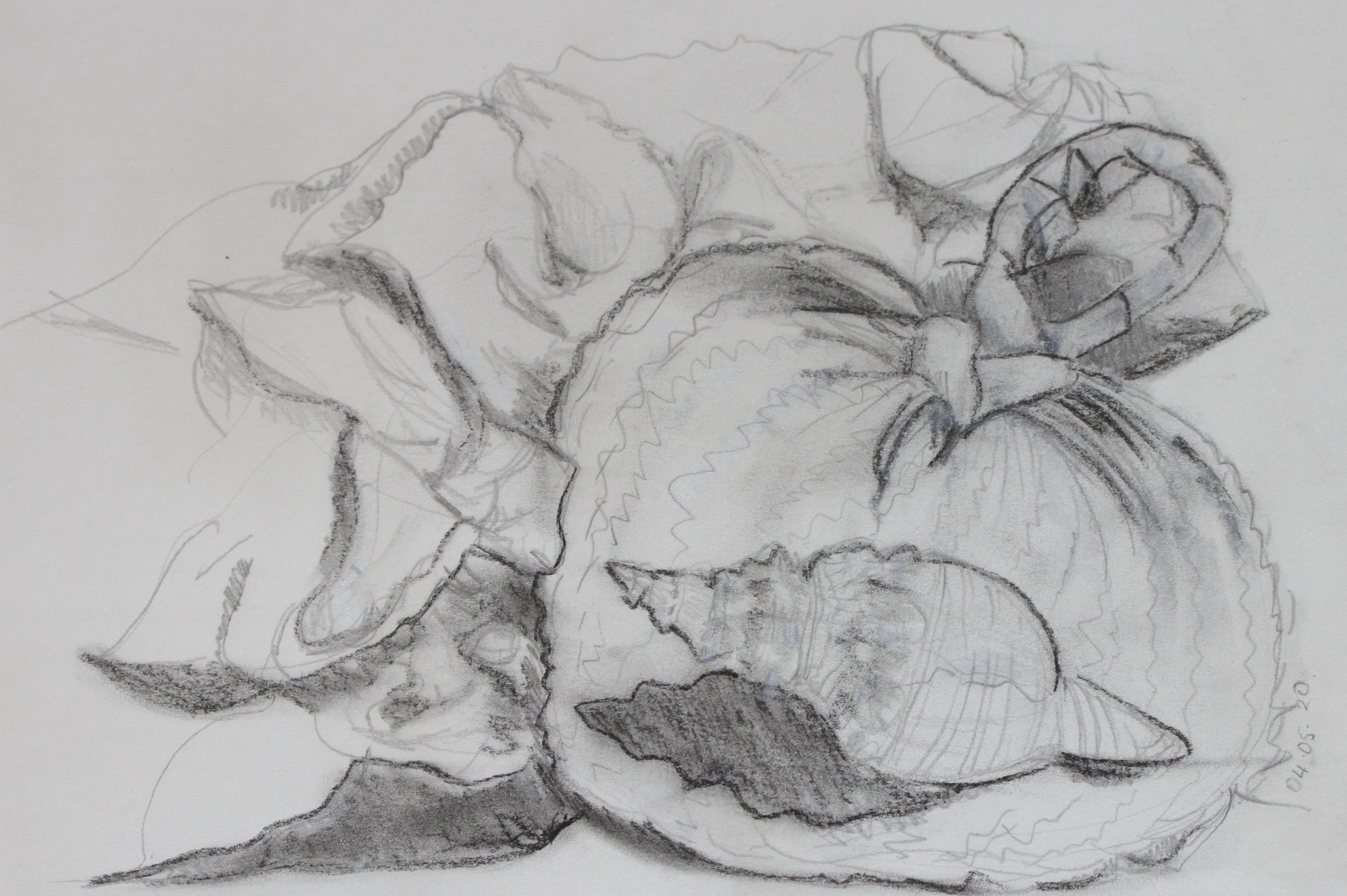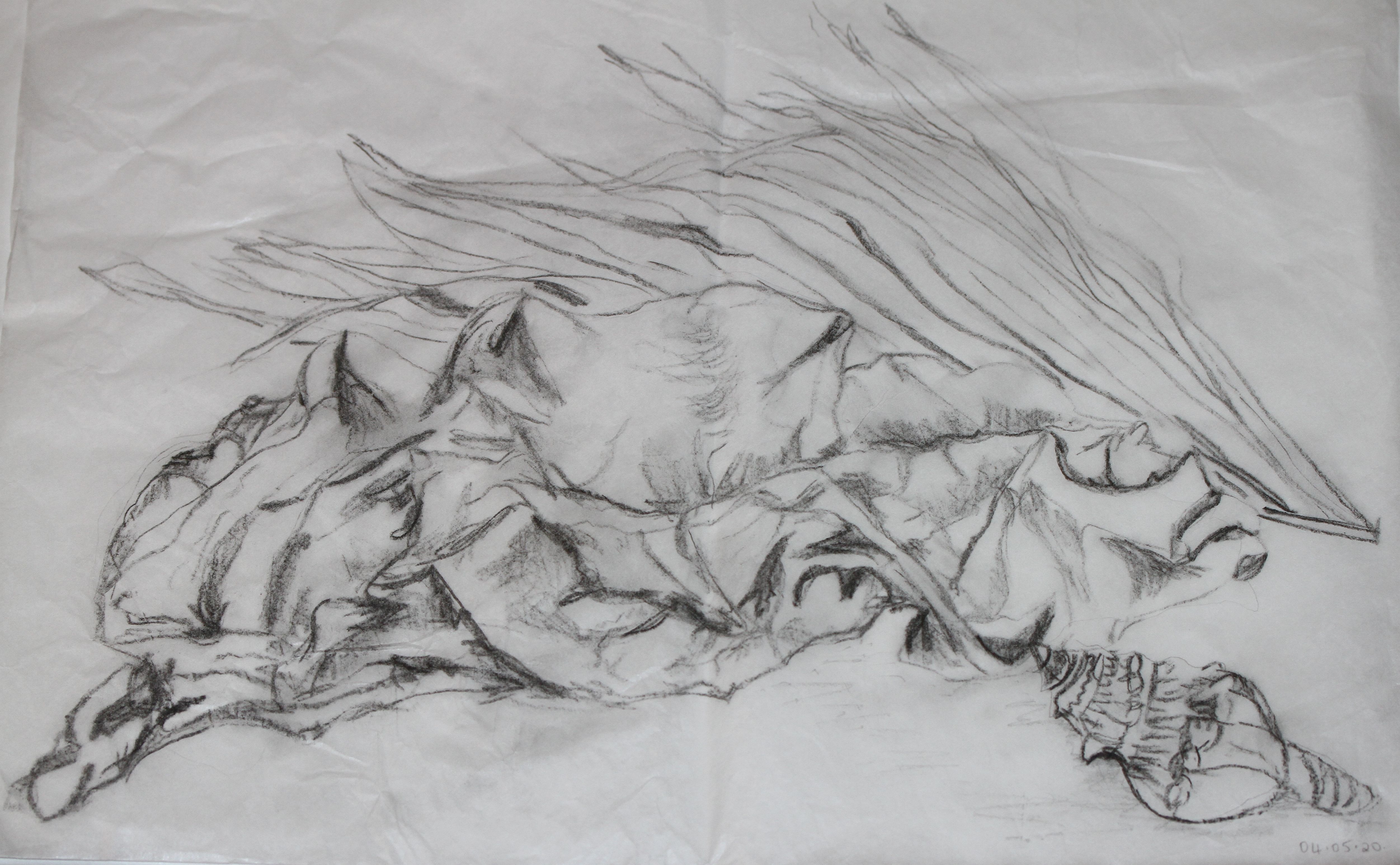 The tissue paper seemed the perfect base for this drawing, as it has the same light and breezy texture as the sarong, which I was attempting to capture. The rumples and drapes of the sarong were best captured by observing the shadows; hence I changed from graphite pencil to charcoal to express these more adequately. Drawing fabric drapes is tricky!