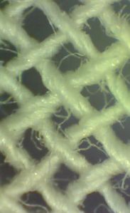 Microscopic examination of the fibre shows that piece is made of cotton. The fibres show the characteristic twist of cotton.