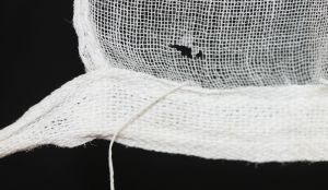 The collar was starched and stored this way, no doubt contributing to the level of damage it has sustained. There are numerous holes, probably from silverfish. Baker (2008) recommends laundering items prior to storage to avoid this issue. There are also stains which may just be from storage, or on the item prior to storage.
