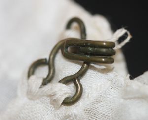 Dorothy has added a metal hook and eye at the neck; it must have gaped when she wore it. Another metal hook and eye has been added to the bottom of the article to make it close, which would have made it stay in place under the top layer clothing, and would have given something to pull against when tying the tapes at the side.