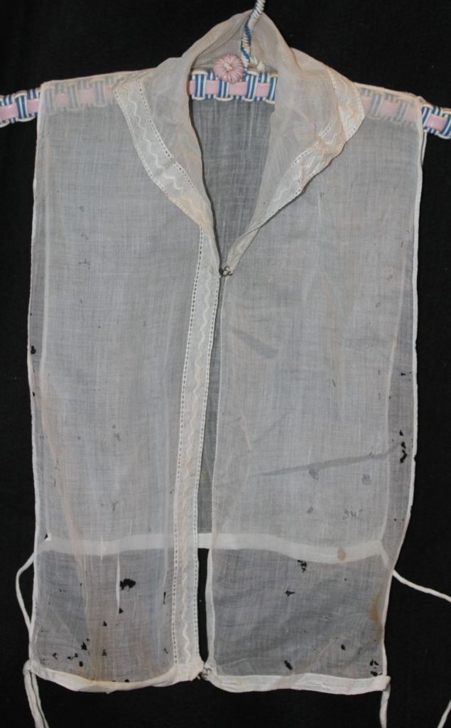 The item is damaged by silverfish which have eaten a myriad of holes through the cotton. It also has brown marks and spots from age and storage. As noted above, I will attempt to launder the collar before storage; hopefully, it will brighten and the spots will be removed in the process.