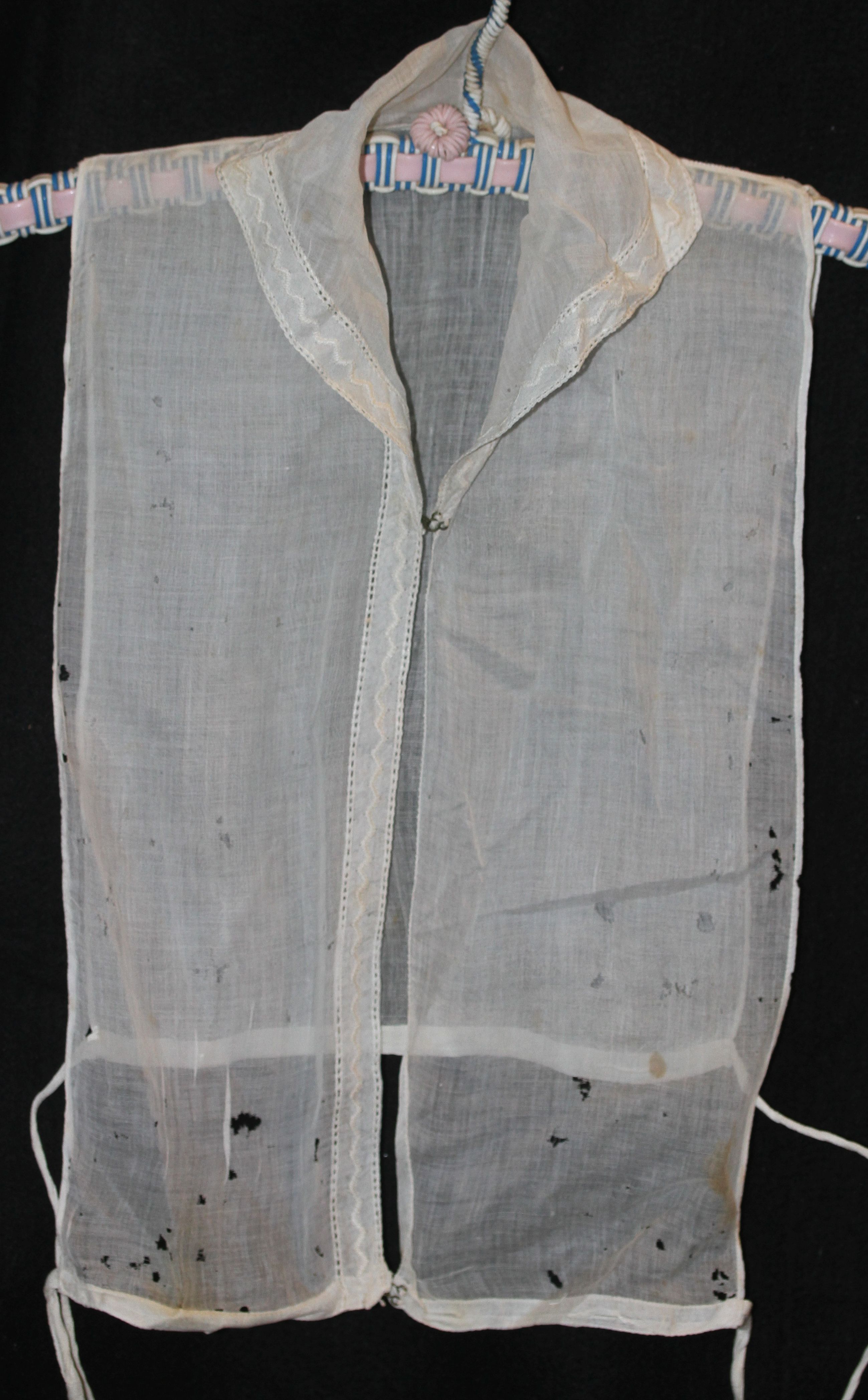 The collar appears to have been worn quite often. There is a small pull between the shoulder and neck seam that appears to be stretching due to wearing and laundering. The voile is thin and fragile, and would have been delicate-looking even when new,