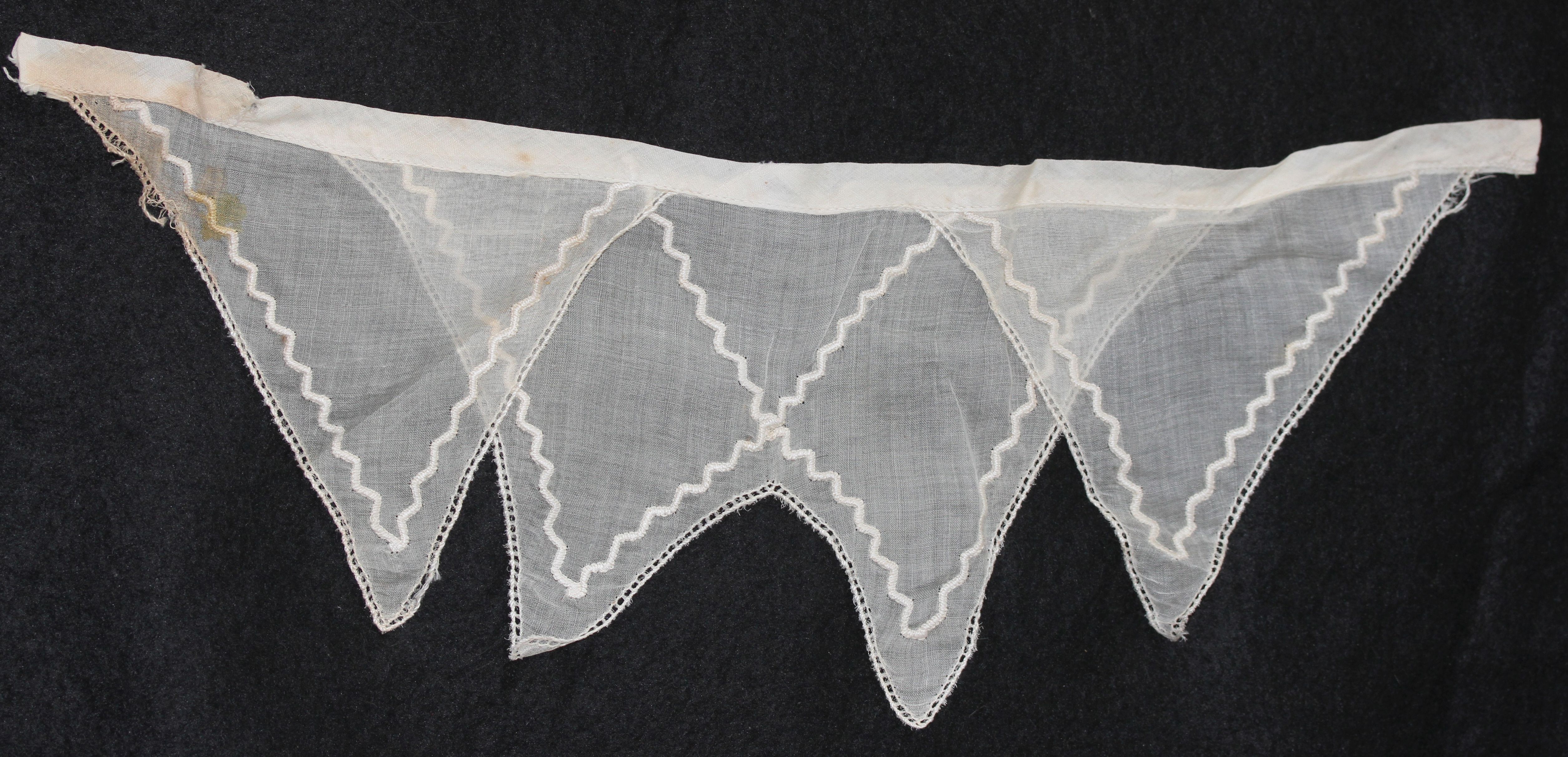 The item is damaged by silverfish which have eaten a myriad of holes through the cotton. It also has brown marks and spots from age and storage. As noted above, I will attempt to launder the collar before storage; hopefully, it will brighten and the spots will be removed in the process.