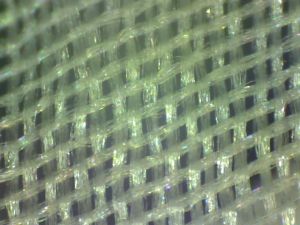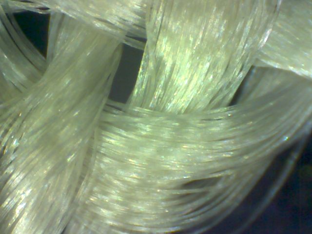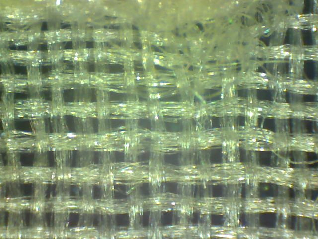 At this magnification, striations in the material (that would indicate rayon) are visible, but not well enough to leave no doubt. Further investigation with a burn test showed that the lace fibre burned completely away, even when the flame was removed, leaving very little ash, indicating the fibre is rayon (Willard).