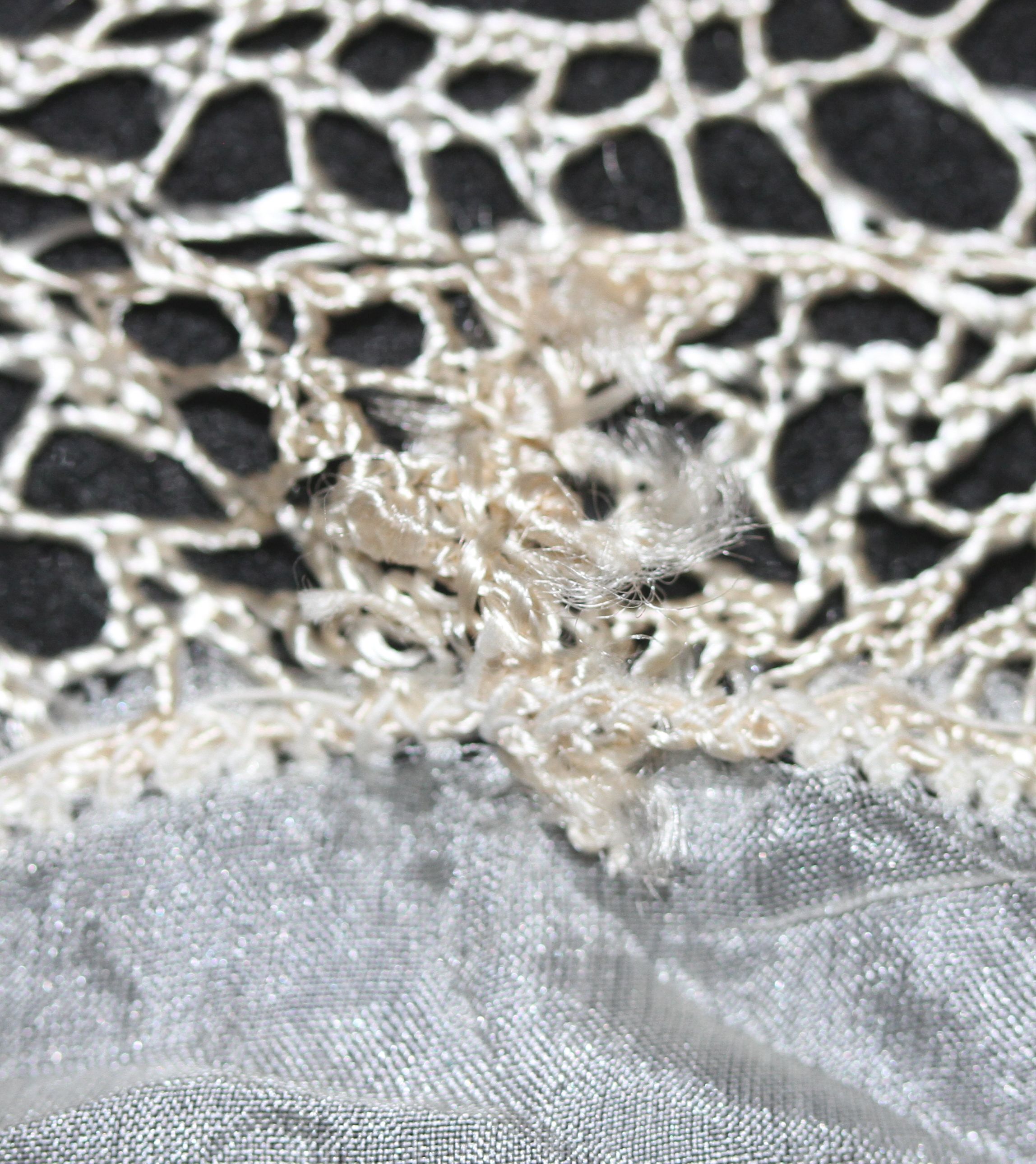Additionally, the silk shows small ‘pulls’, and micro-tears where it is machine-sewn to the lace. Vilaplana (2017) found that silk loses tensile strength with age, due to both physical and chemical breakdown: “the brittleness of the historic silk fibres [is] caused by combined physical (e.g. chain reorganisation) and chemical (e.g. chain scission and oxidation reactions) structural effects during their natural ageing”.