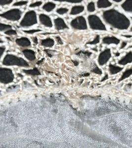 Only one of the four rayon threads connecting the inner edge of the lace to the silk is still in tact. Given the handkerchief’s probable lack of use, this demonstrates its fragility. Neal et al (2004, p. 225) state that rayon is weaker than silk, cotton and linen.