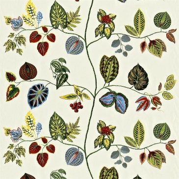 This is a sumptuous embroidered fabric from the Frangipani collection. “Arlecchino illustrates a fantasy vine with an array of leaves growing from one stem. Bunches of berries sit amongst the colourful leaves each embroidered with incredible detail to illustrate the vibrant patterning found in nature” (stylelibrary.com, nd a).