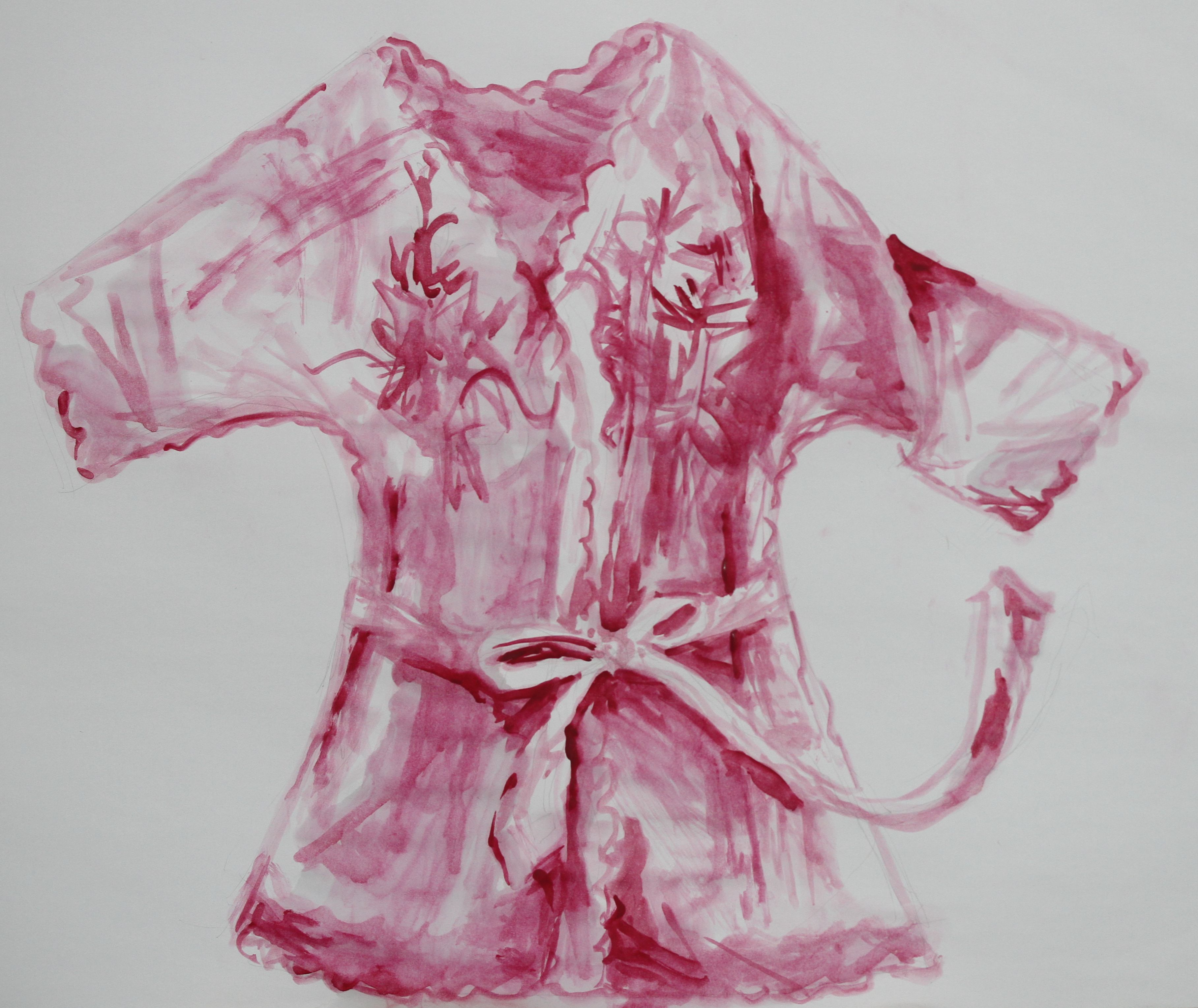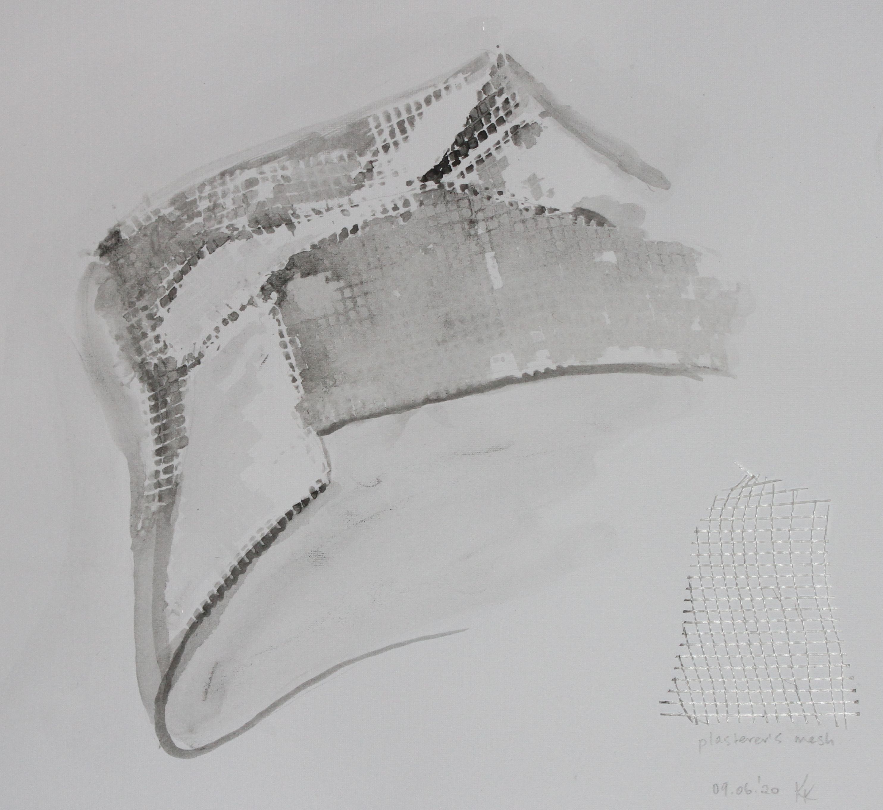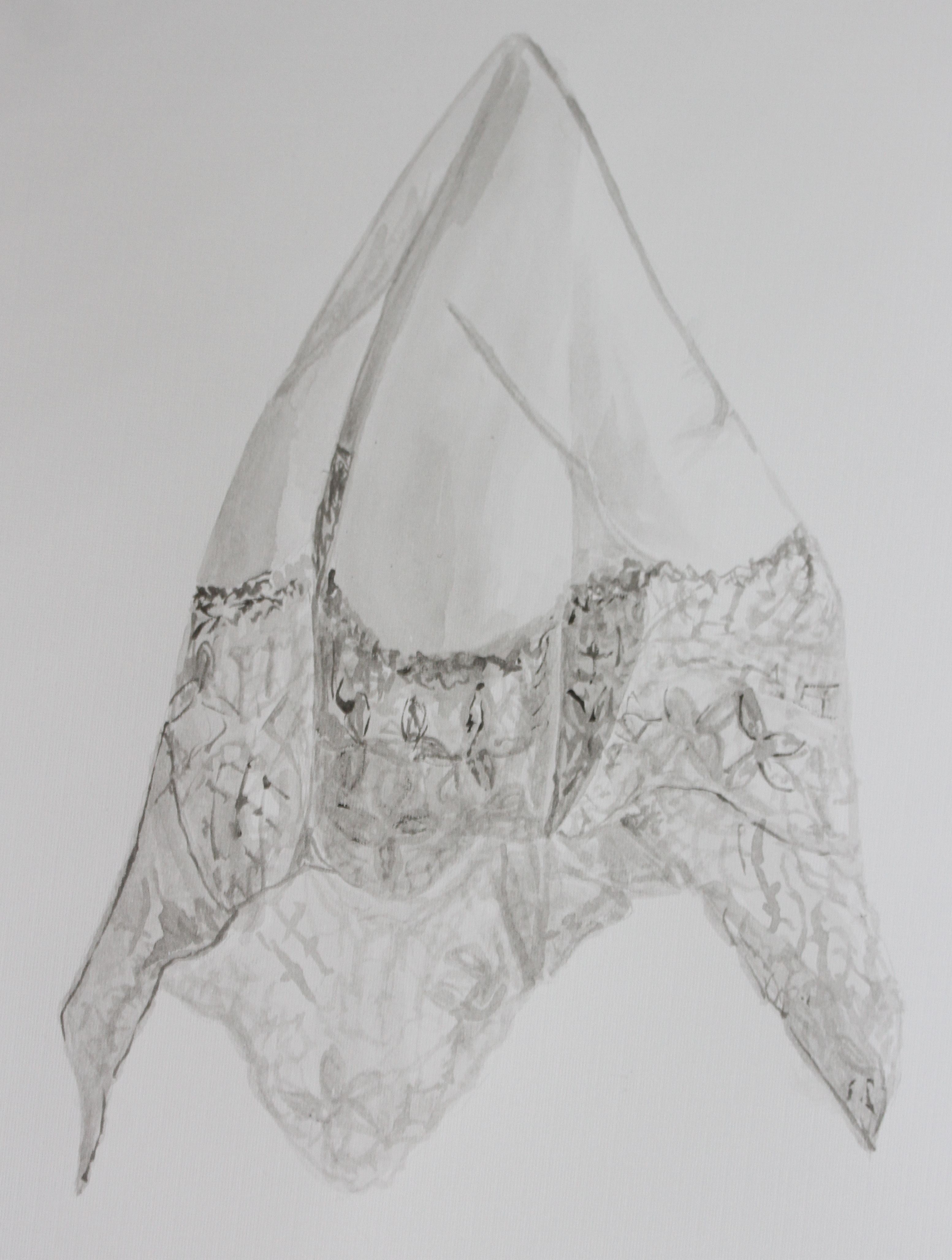 Here, I am attempting to depict the stiffness of the starched voile. I laid plasterer’s mesh over a sketch, imitating the lie of the weave, then painted over to show the dark and light parts of the fold. I also chose some very stiff water-colour paper with a subtle criss-cross pattern. Here I am really experimenting and pushing myself.