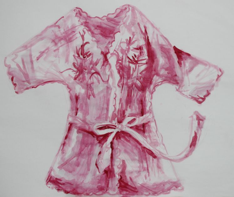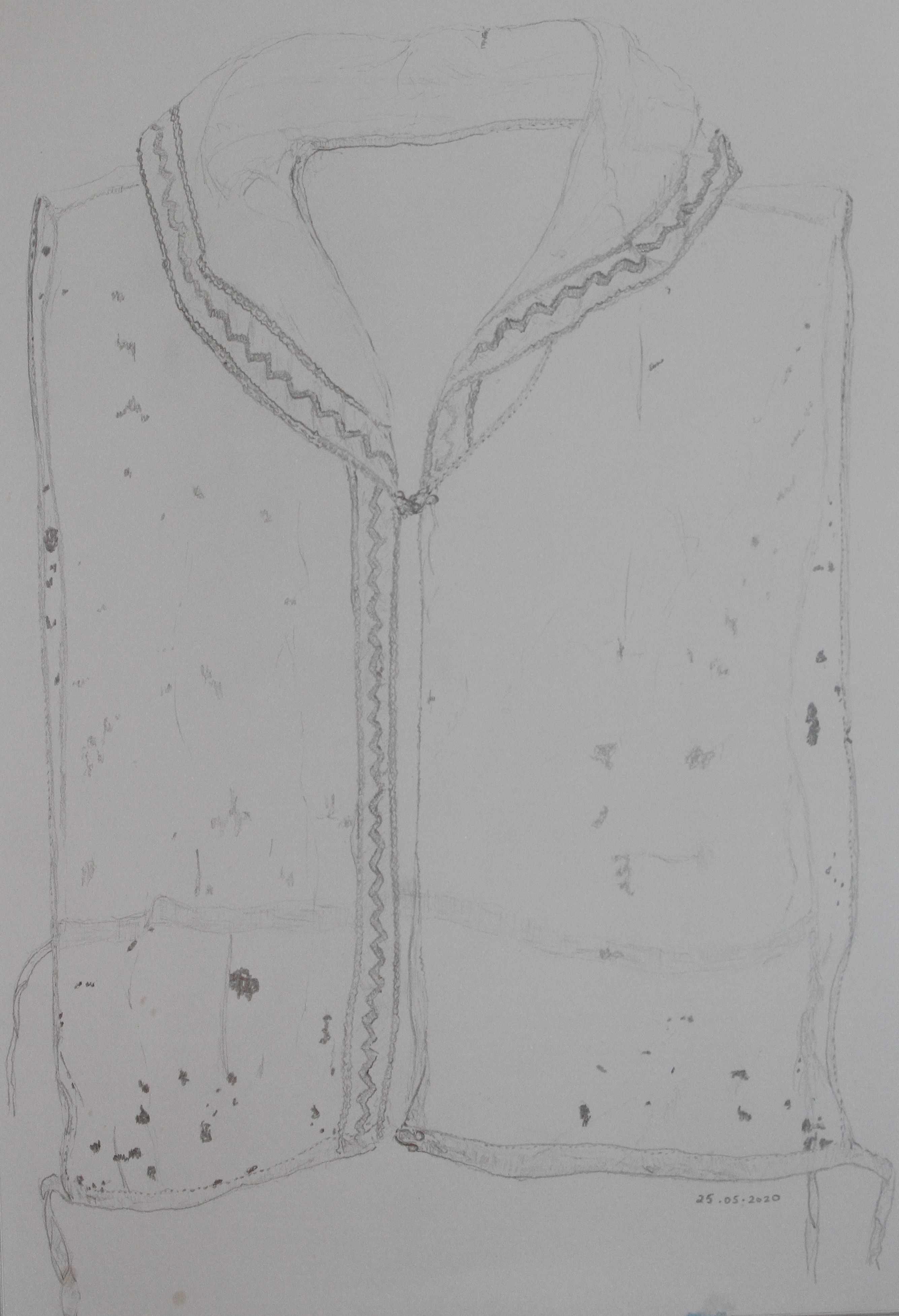 Another drawing showing the overall morphology of the item. I wanted to break away from the really detailed pencil drawing that I had done for the other items, to try something different and expand my repertoire. So I tried doing a ‘rough’ painting; the first time I had attempted this technique. My only rule was to paint the shadows and the folds as honestly as I could.