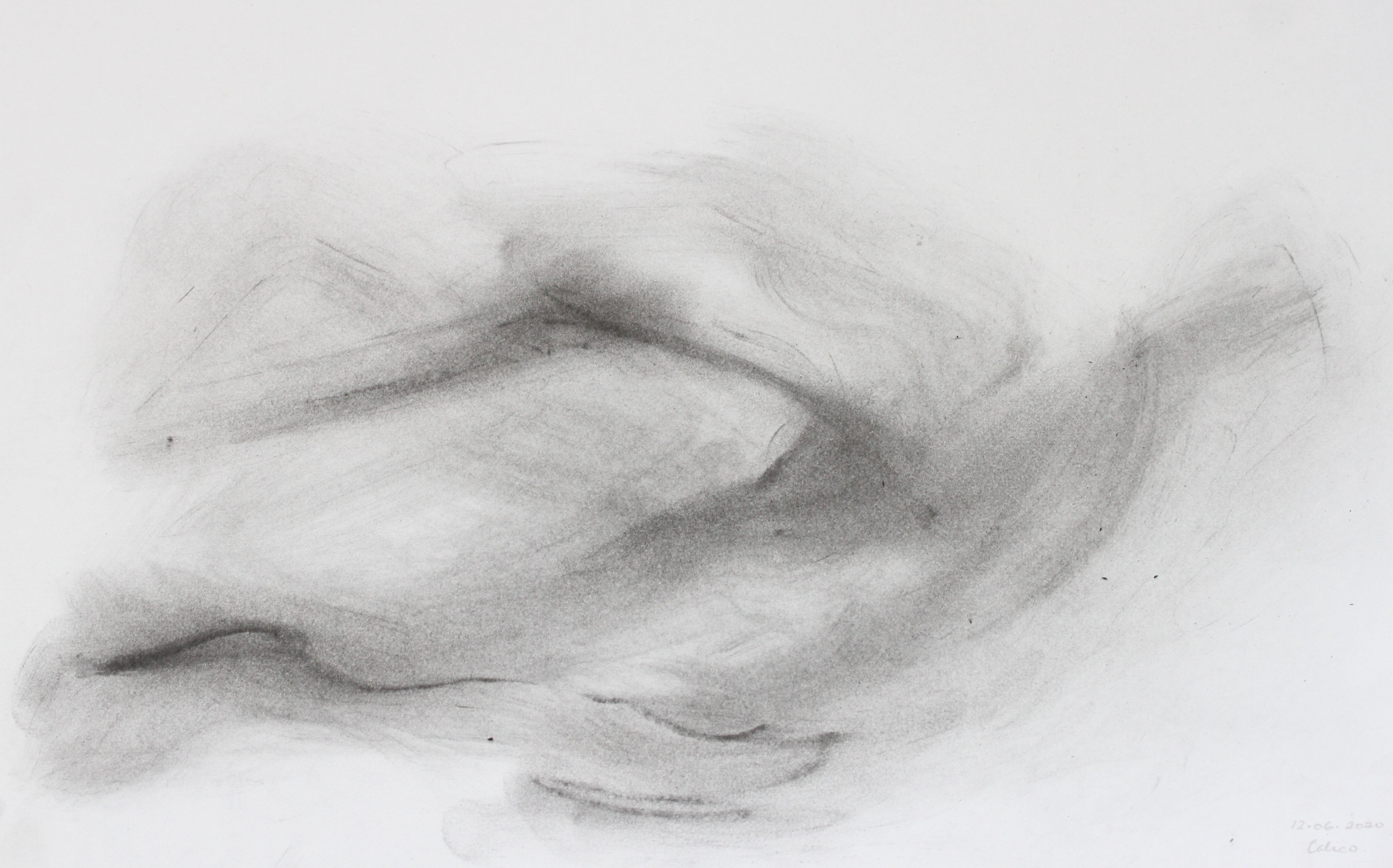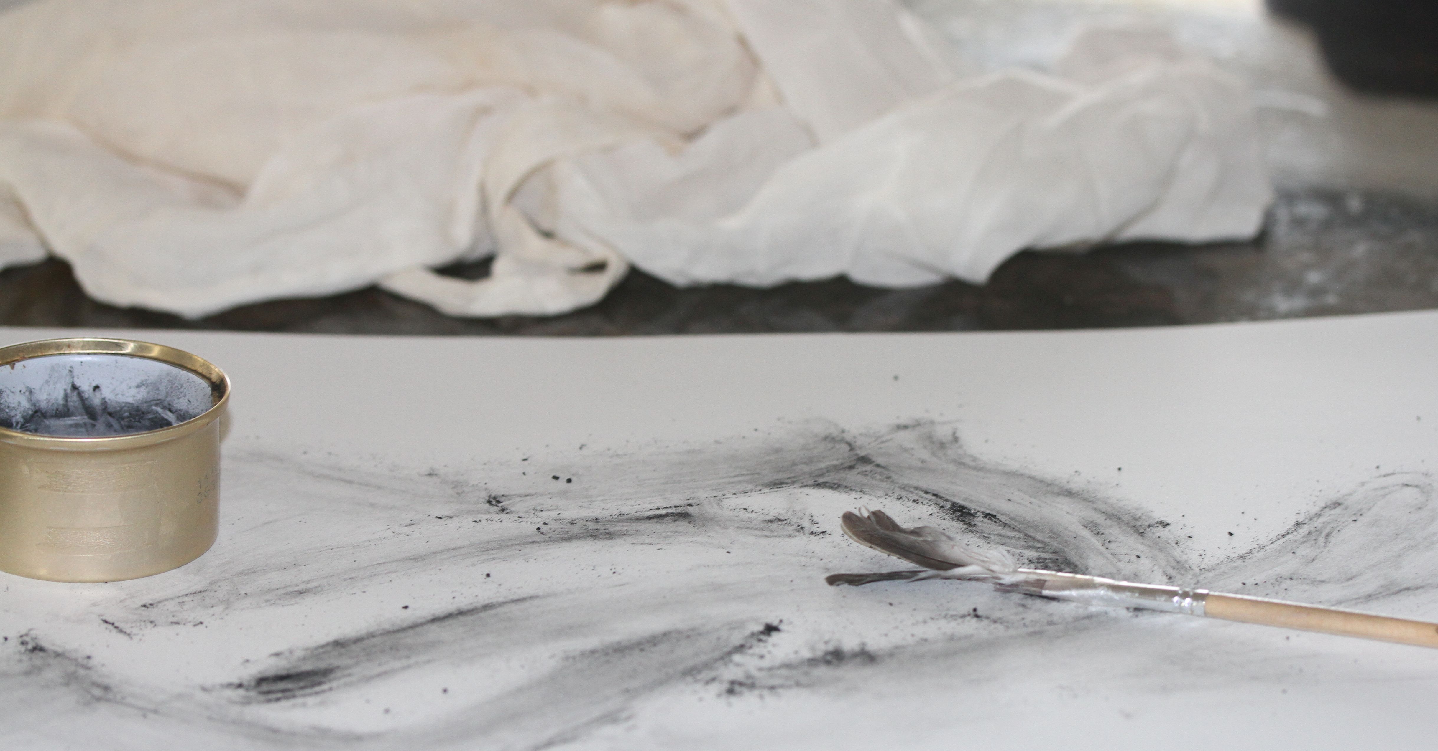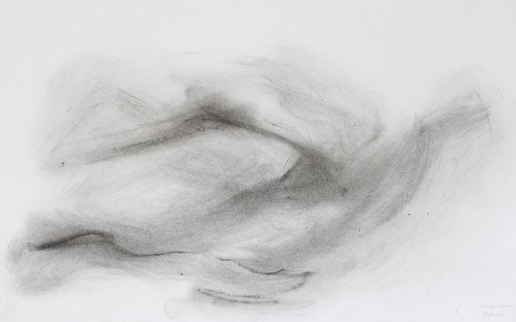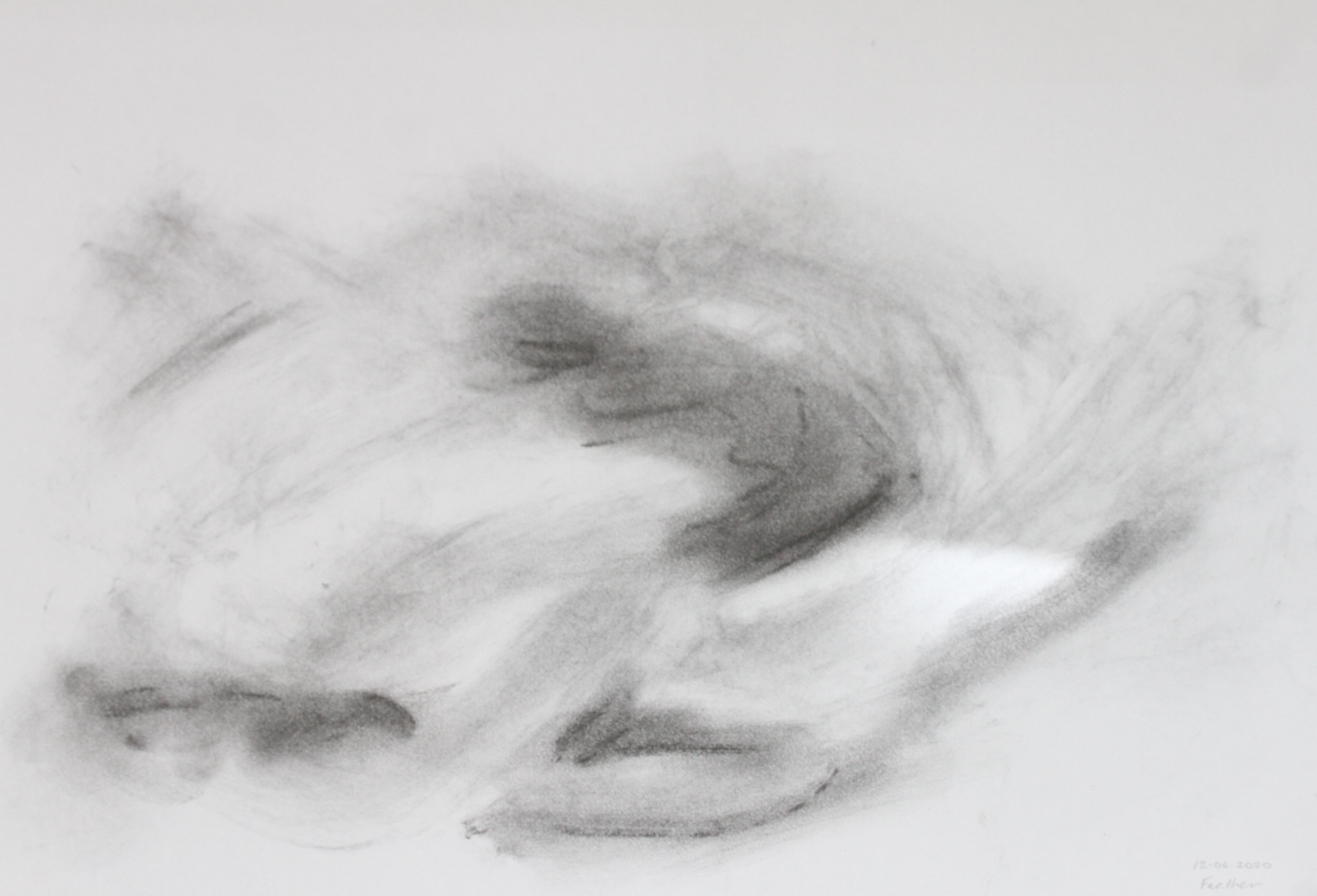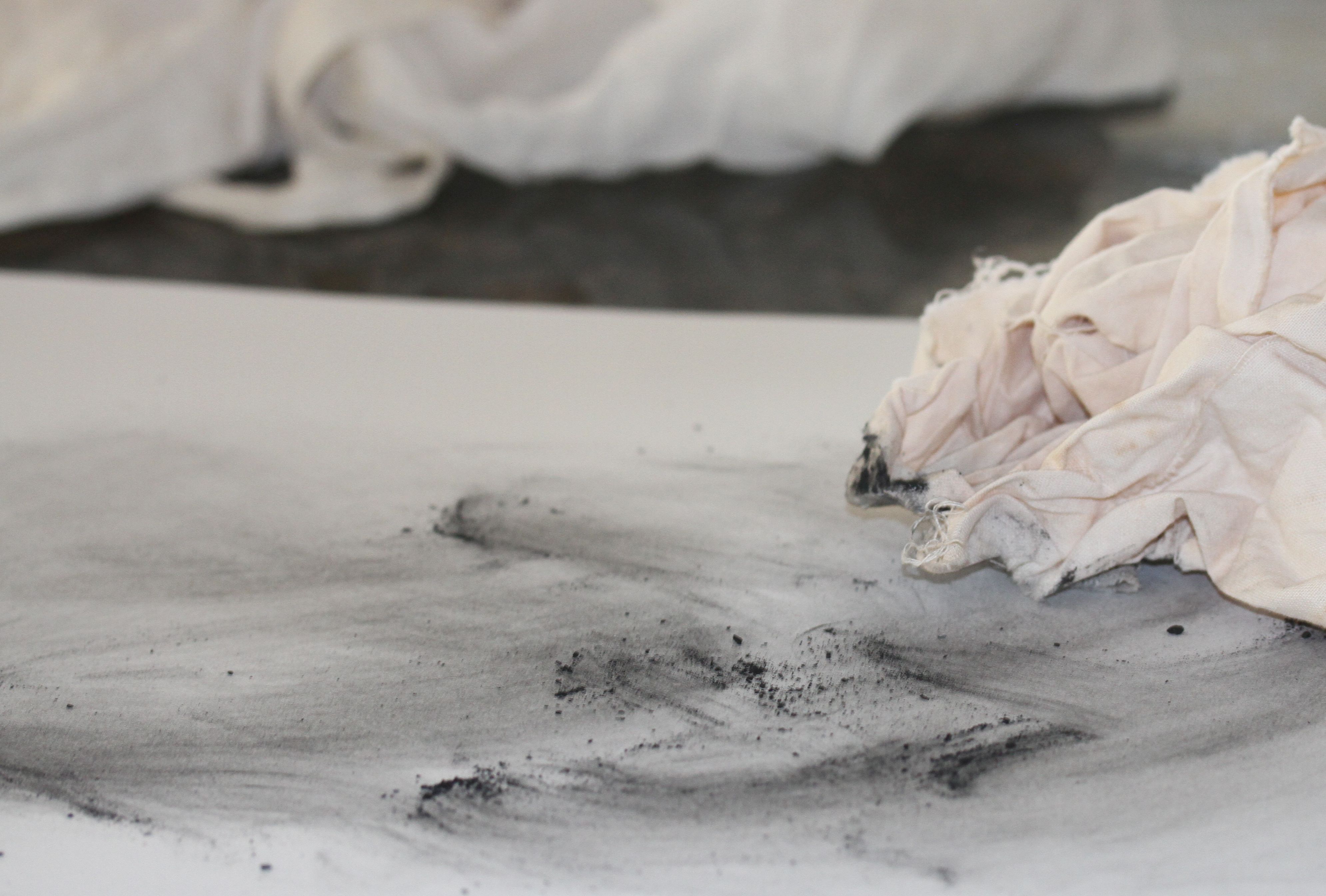 I wanted to capture the softness of the voile, so went about making and finding media to represent this. I used some feathers, then some soft calico to spread ground charcoal. You can see the bad-jacket in the background.