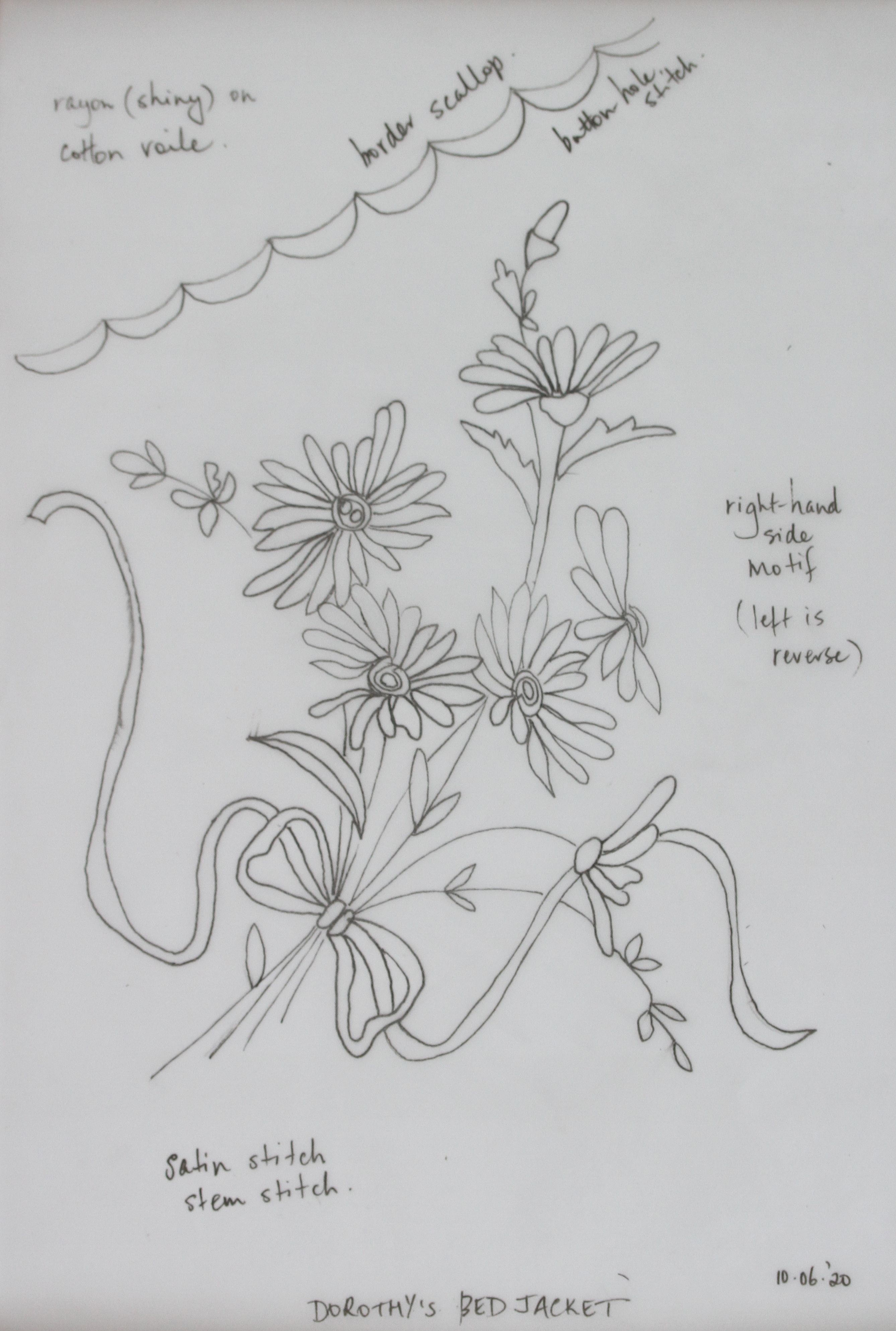 To properly document the bed-jacket, I traced the embroidery design. It is presented as open shapes, as it would have probably been an iron-on or traceable pattern; so, it’s back in its original form. As I traced, I though Dorothy may well have done the exact same thing, 100 years ago!
