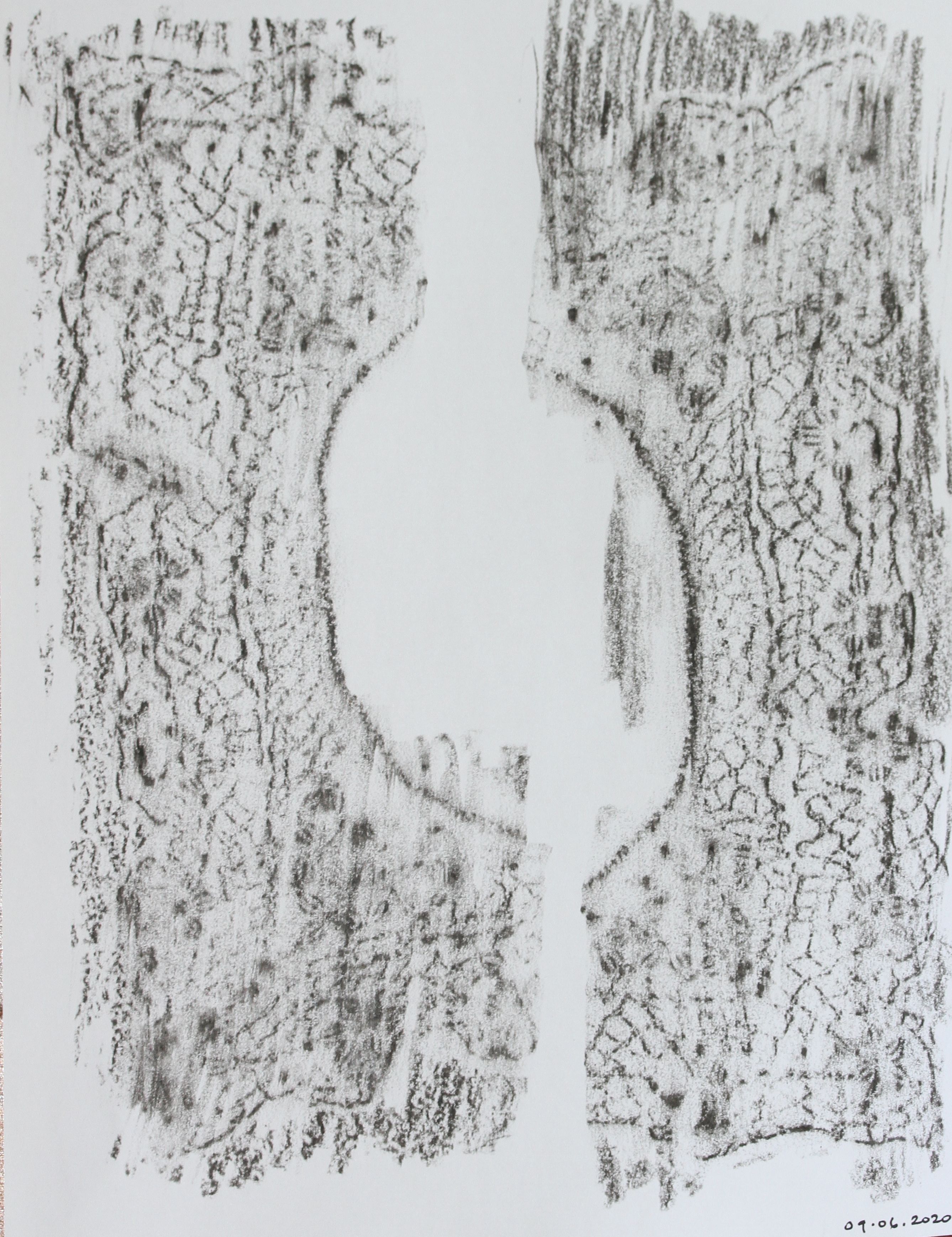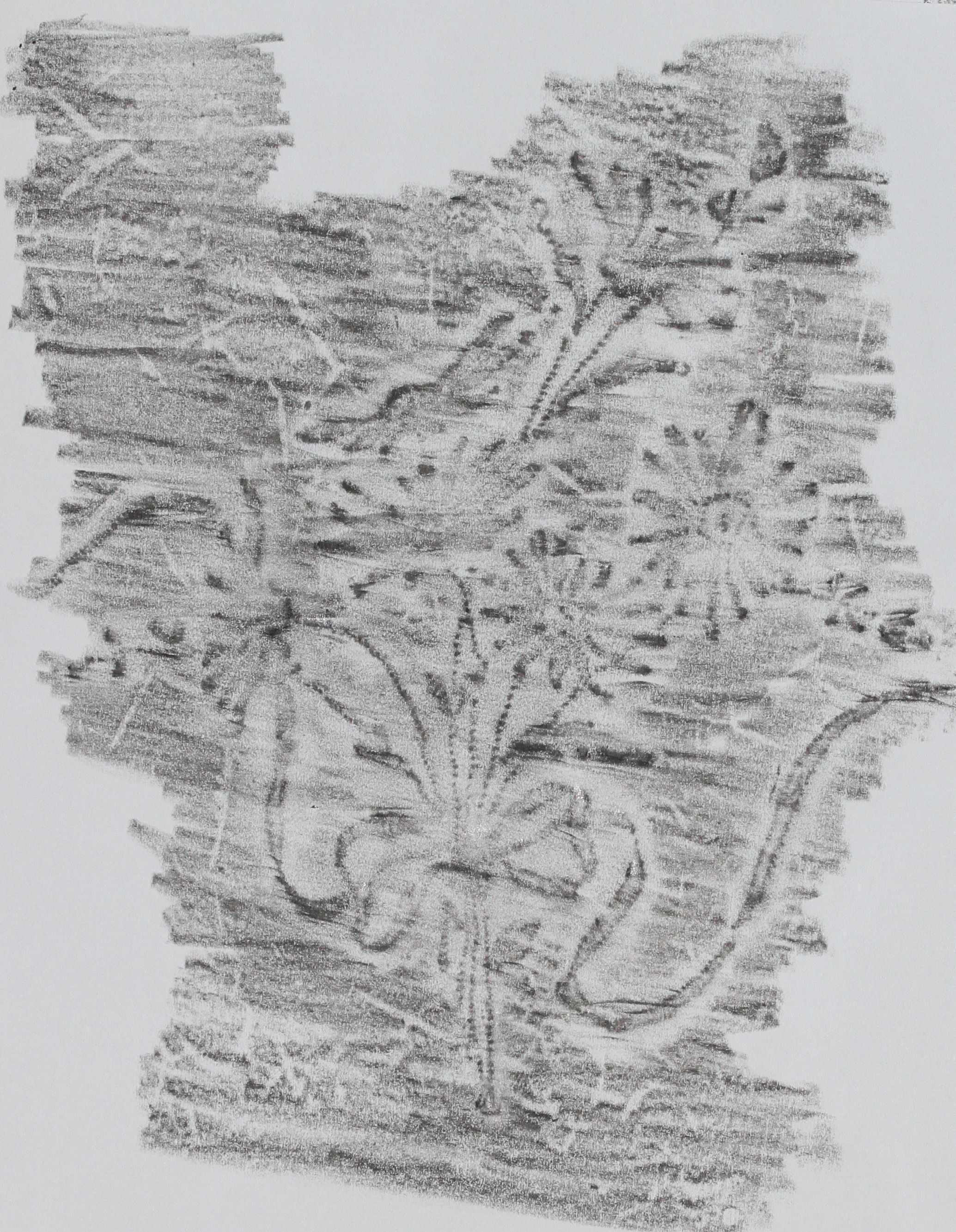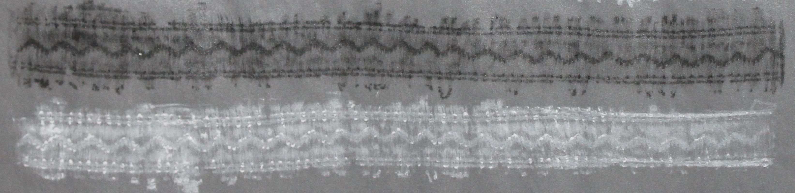 Rubbings over collar embroidery, white and black wax crayon on tracing paper.