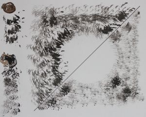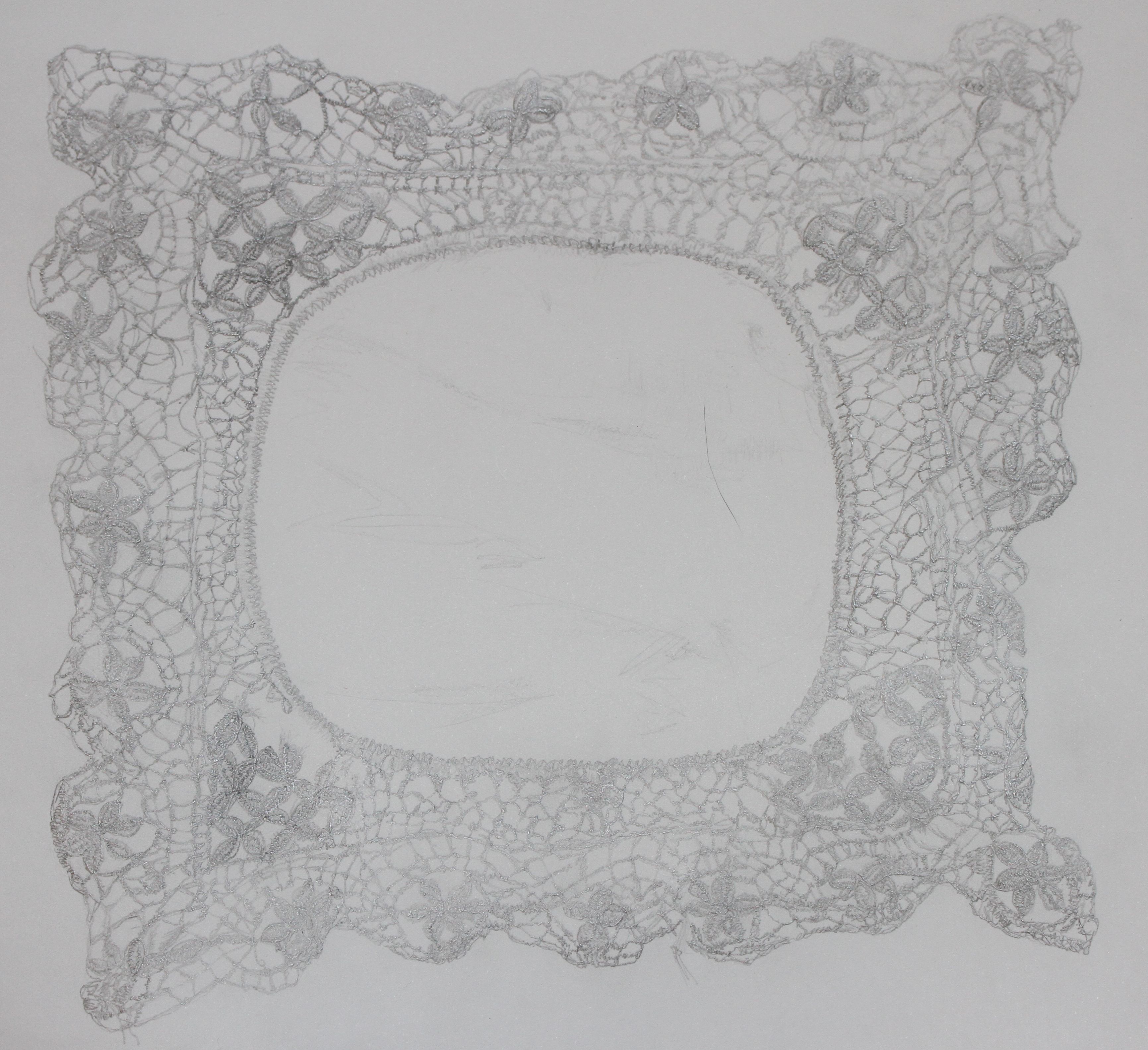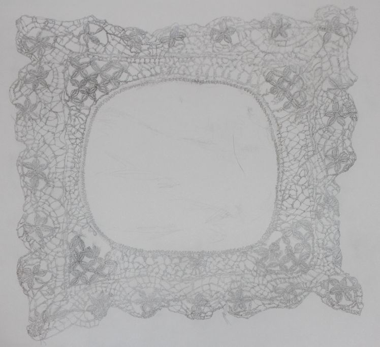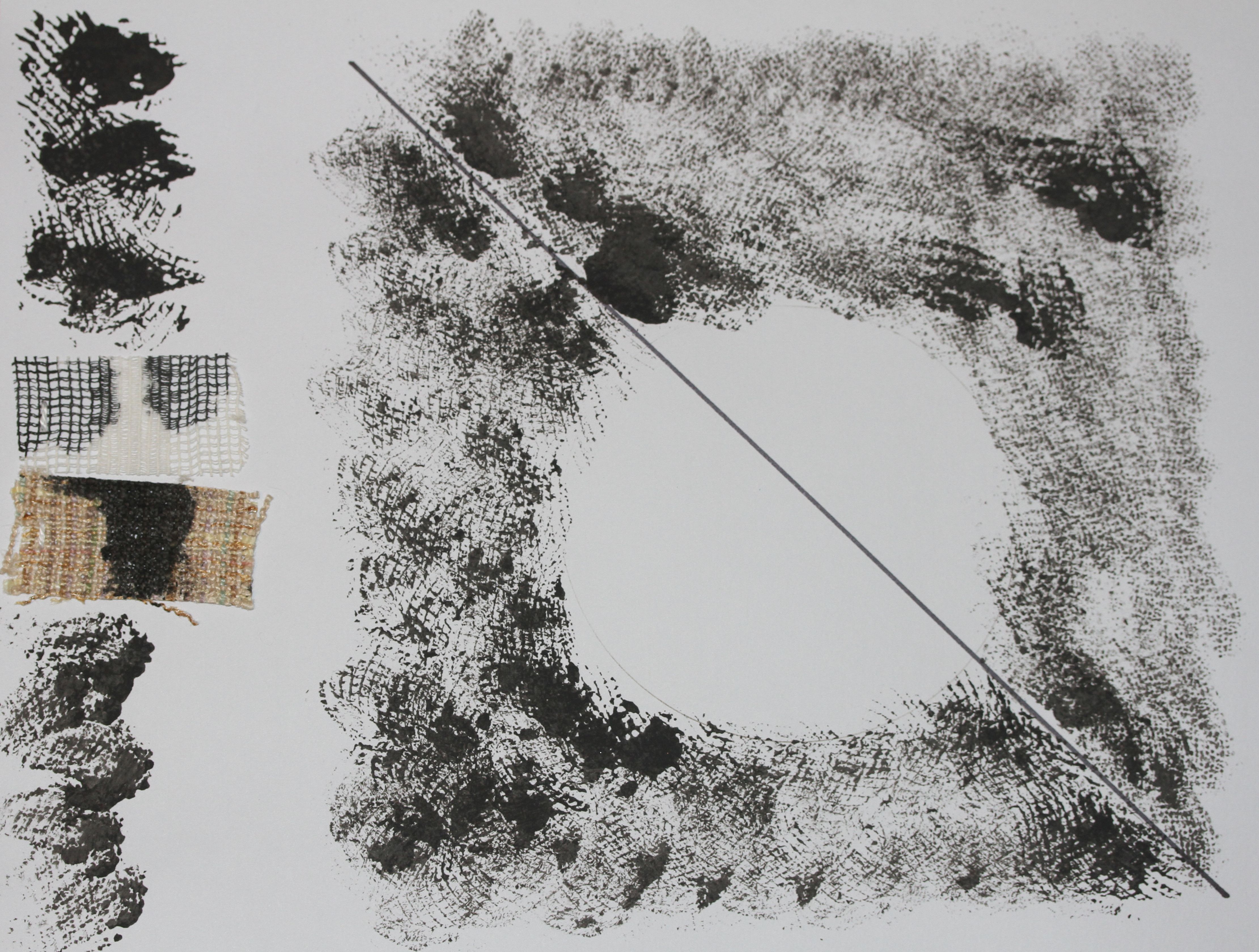 Some experiments making tools. The lace part of the handkerchief inspired me to ‘pounce’ with tulle to depict the delicate marks. However, the tulle didn’t give me the effect I desired. This led to a range of trials, until I was pleased with the marks made with a balled up piece of string.