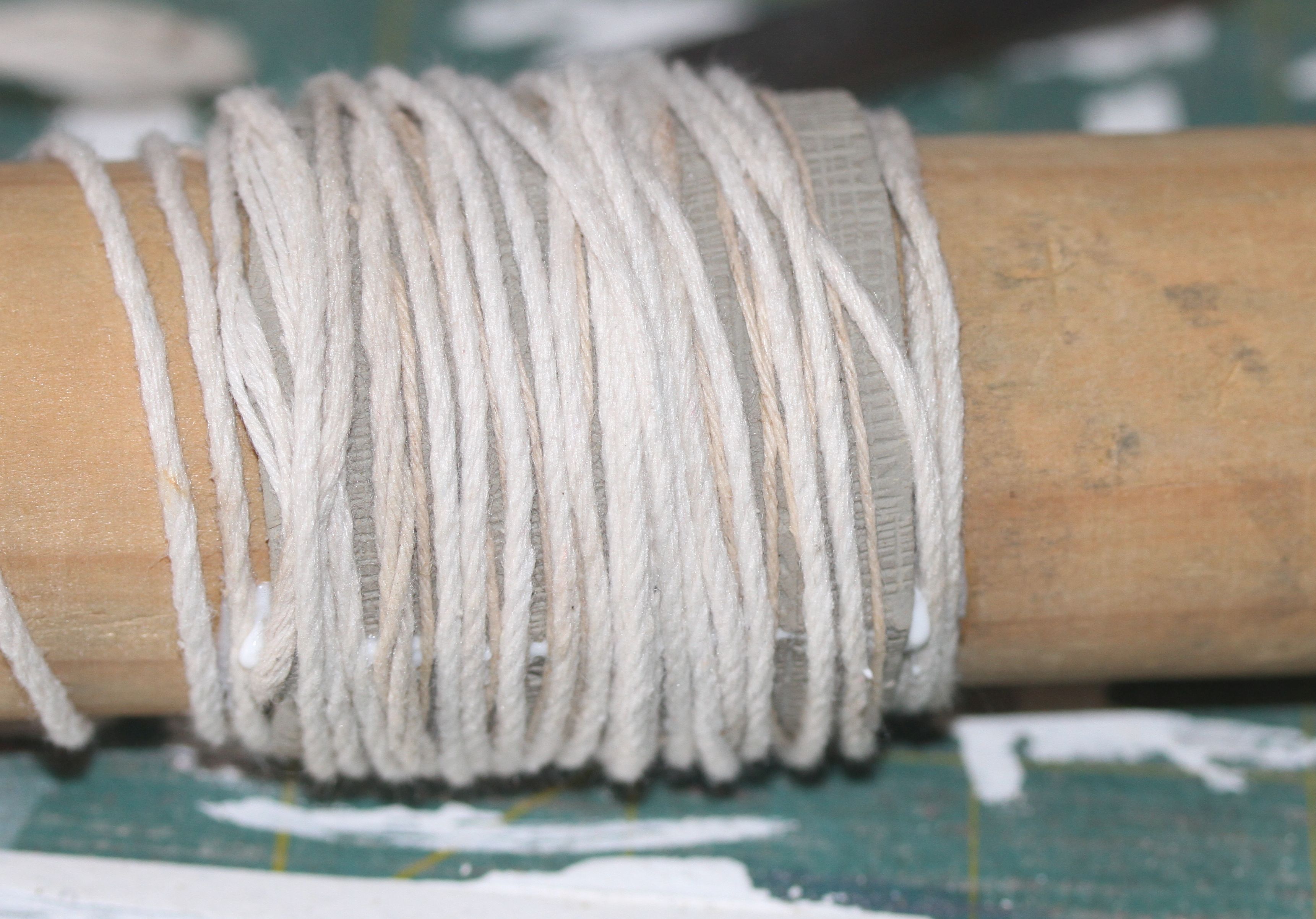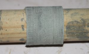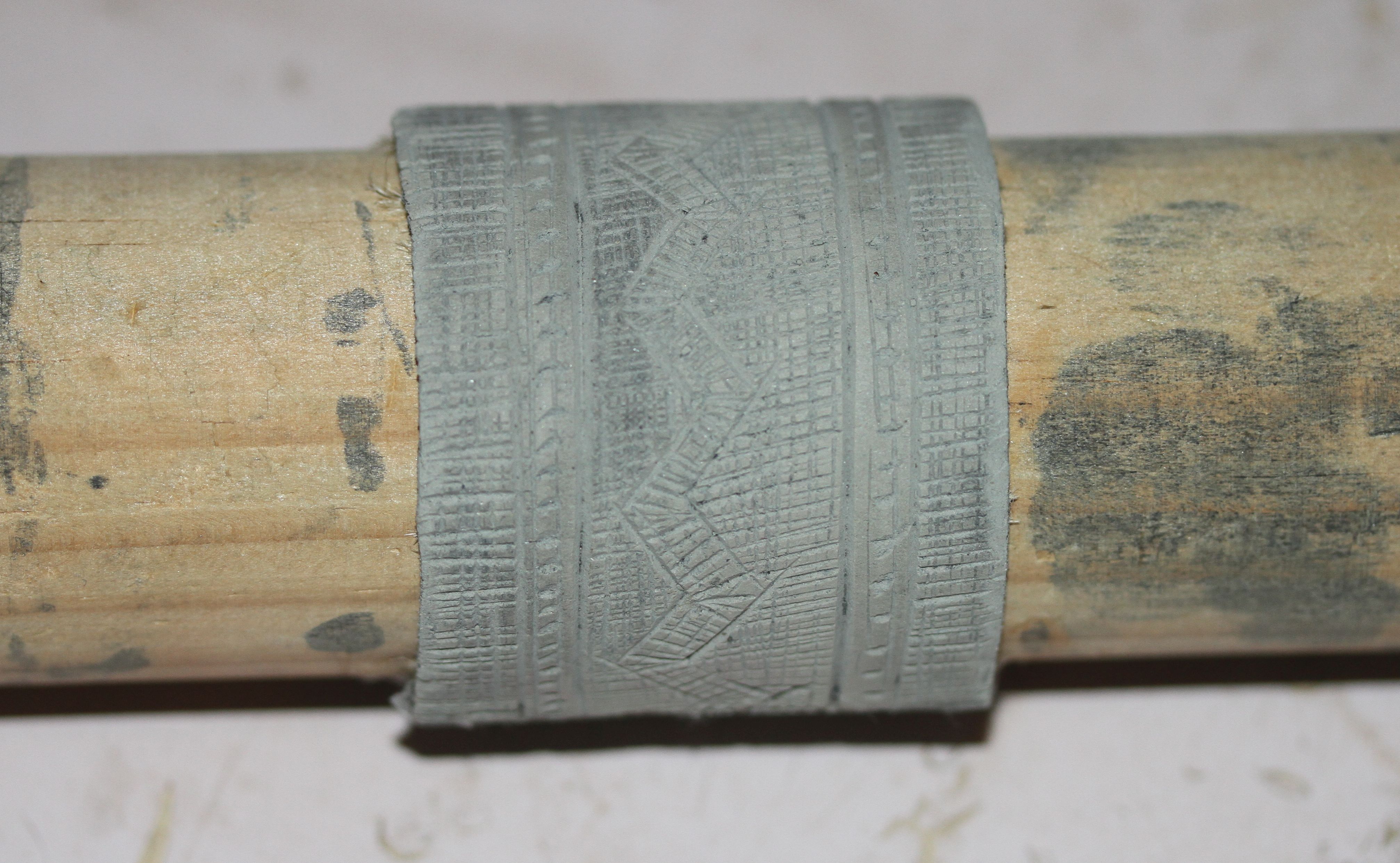 I glued the resultant carving to an old wooden rolling pin (I’ve been picking these up whenever I see them at op-shops, since I ruined the expensive one with a teflon bearing we had in the kitchen when rolling over the pineapple piece earlier). I quite like the naive, yet complex marks that resulted.