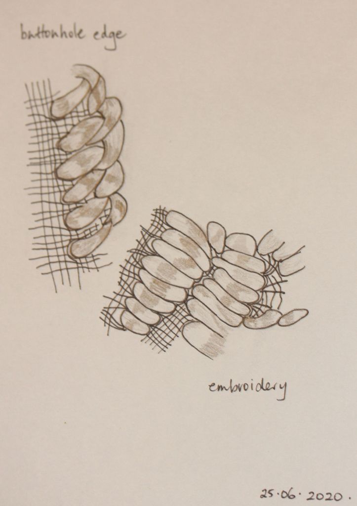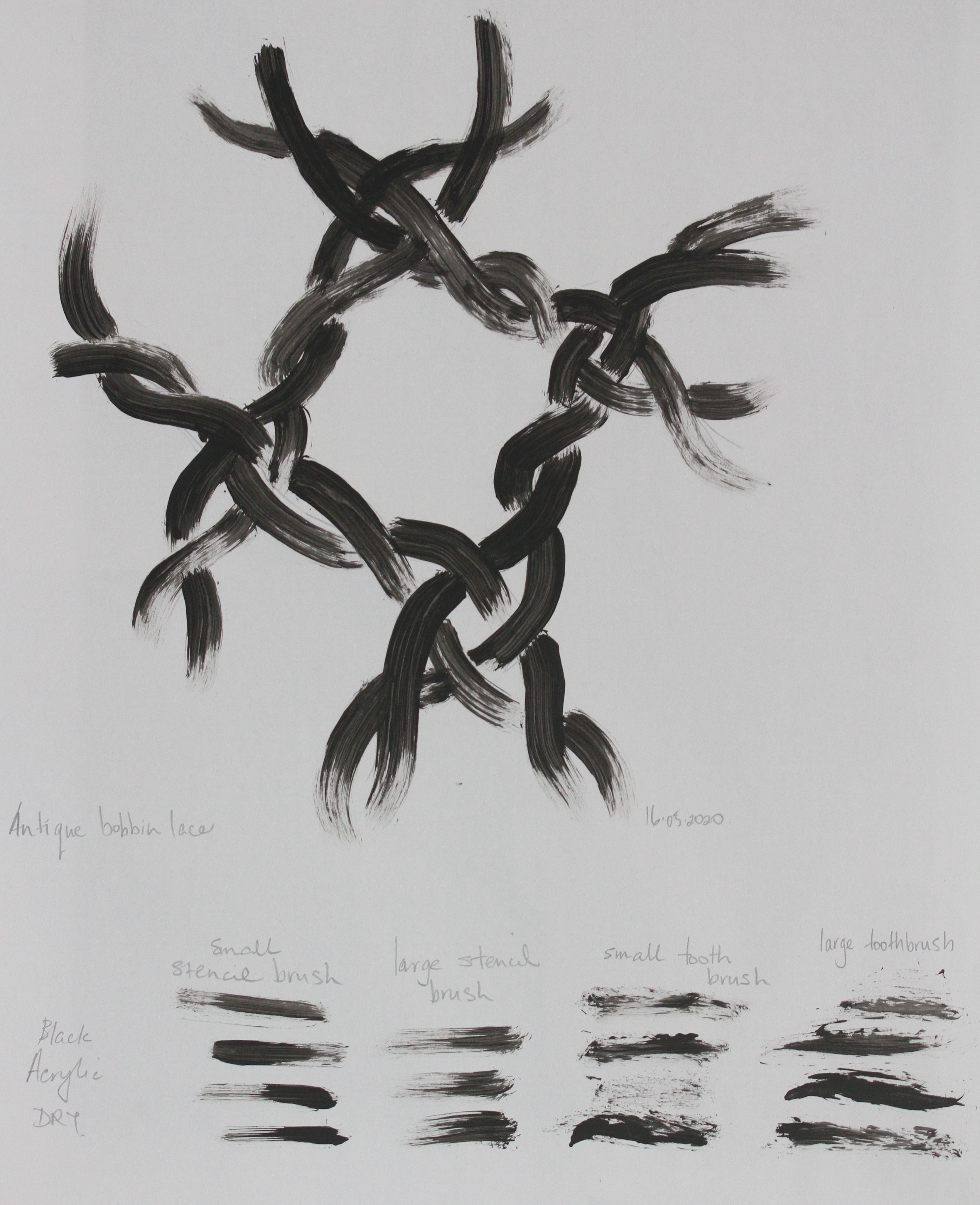 I wanted to capture the intricate weave of the bobbin lace. As I had seen that each thread was made of hundreds of individual fibres, I sought a way to express this. I started by trialling a couple of toothbrushes with which to paint, but the marks seemed too scruffy and didn’t mimic the smooth texture. I settled on a large stencil brush, after trying a couple of sizes.