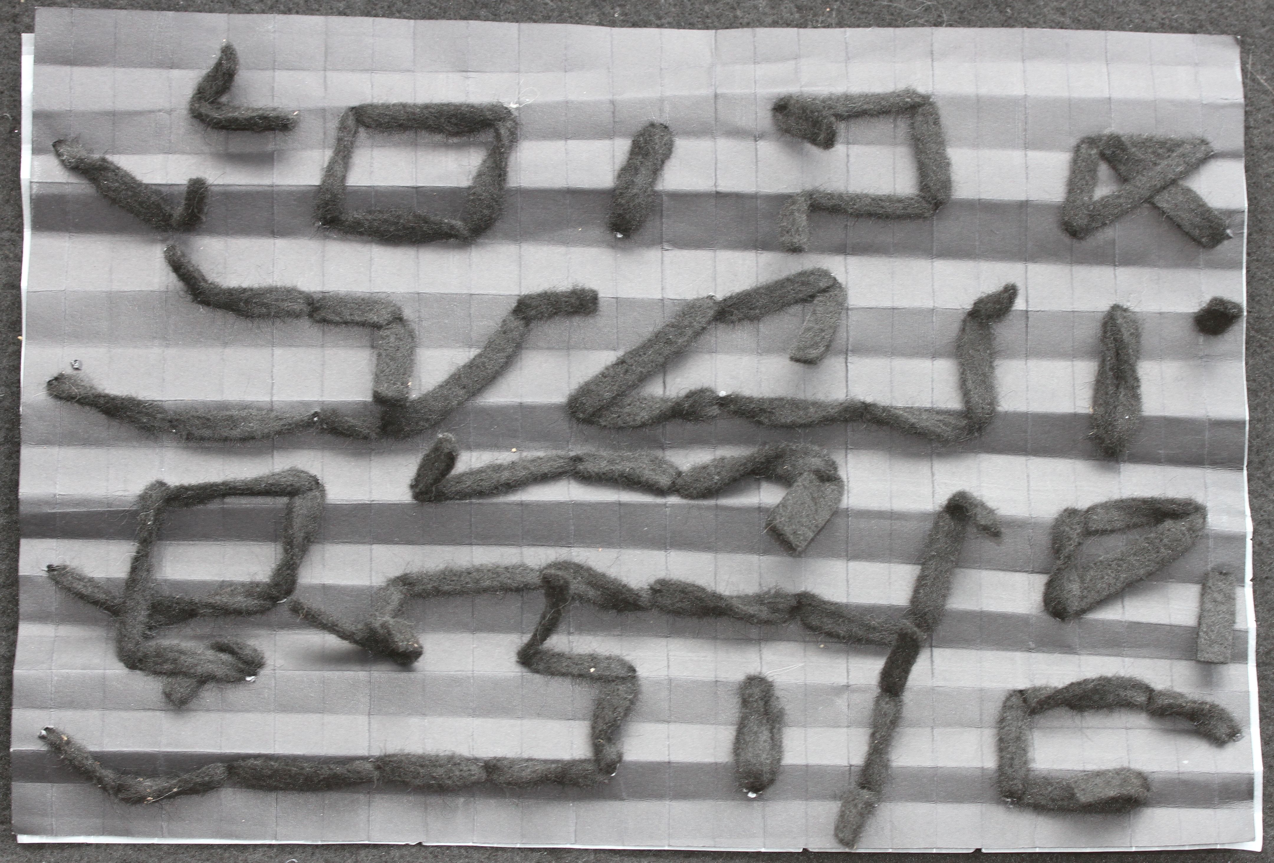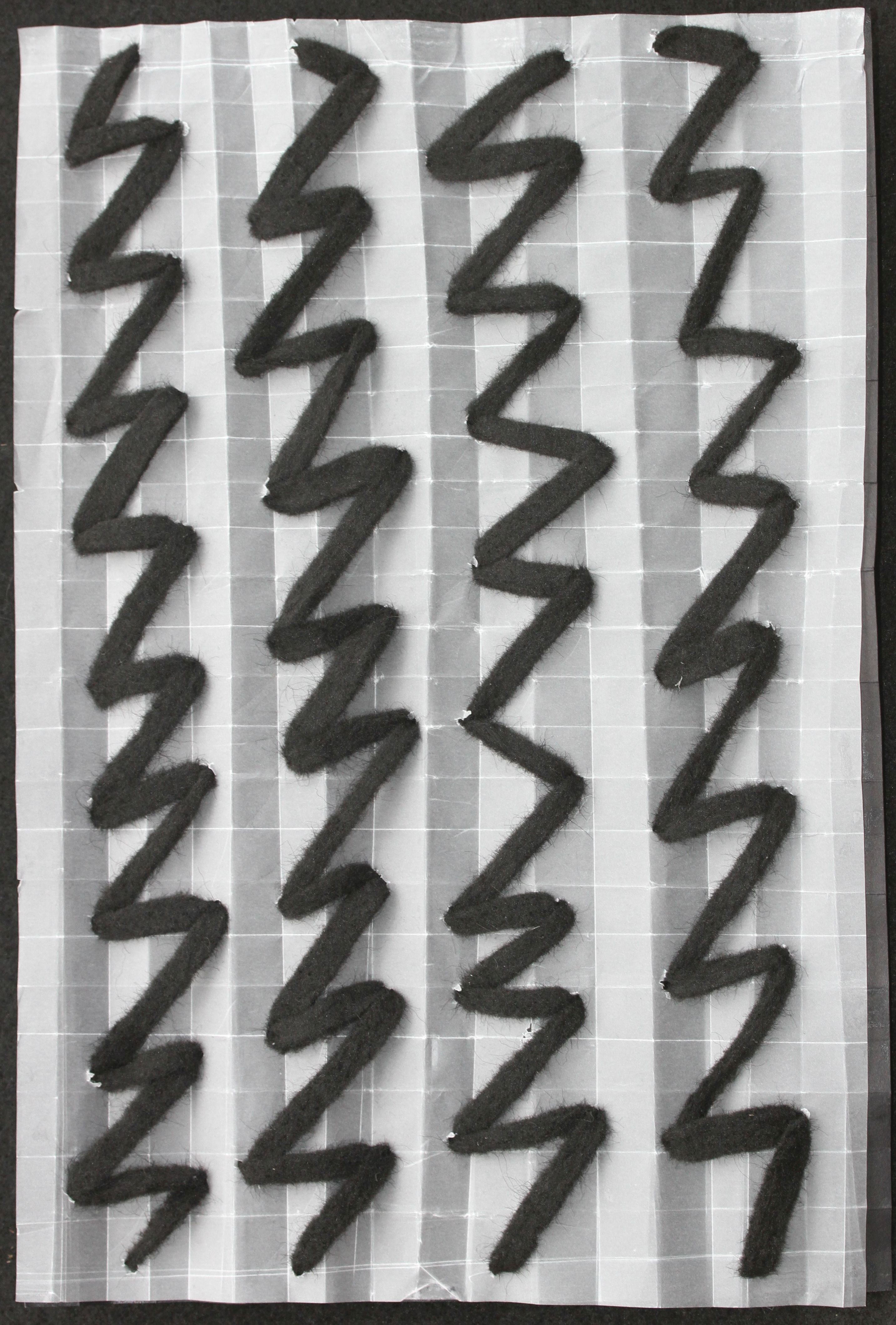 I knew I needed a ragged thread to render the black zig-zags. Thin strips of felt (synthetic) were the winner. The thin strips did not stretch during the sample; however, this was an issue during making the final piece, which required using small lengths and frequent re-threading of my huge tapestry needle.