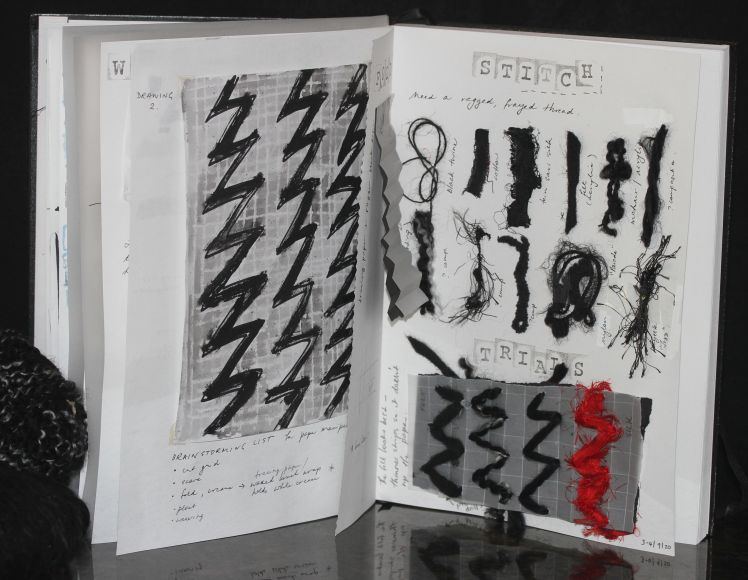The ‘orange’ bag substrate curled, and was not as evocative of the drawing, so I chose the thread wrapped page.