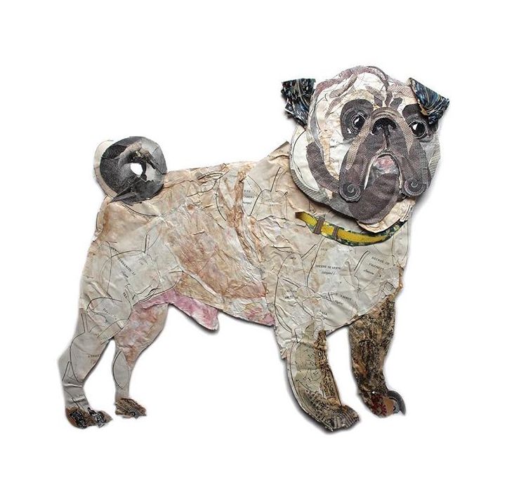 As a study in ‘drawing’ with collage, the pug below, in black and white, allows me to see the expert application of dark and light, and shadow, to analyse his technique. Awe-inspiring.
