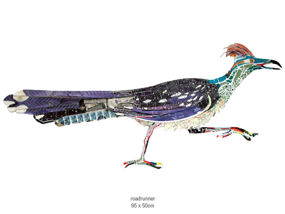 The works certainly have wit and a an entrancing and eye-catching quirkiness. The strategic placement of papers and words is often the source of this wit. This road-runner has ‘tyres’.