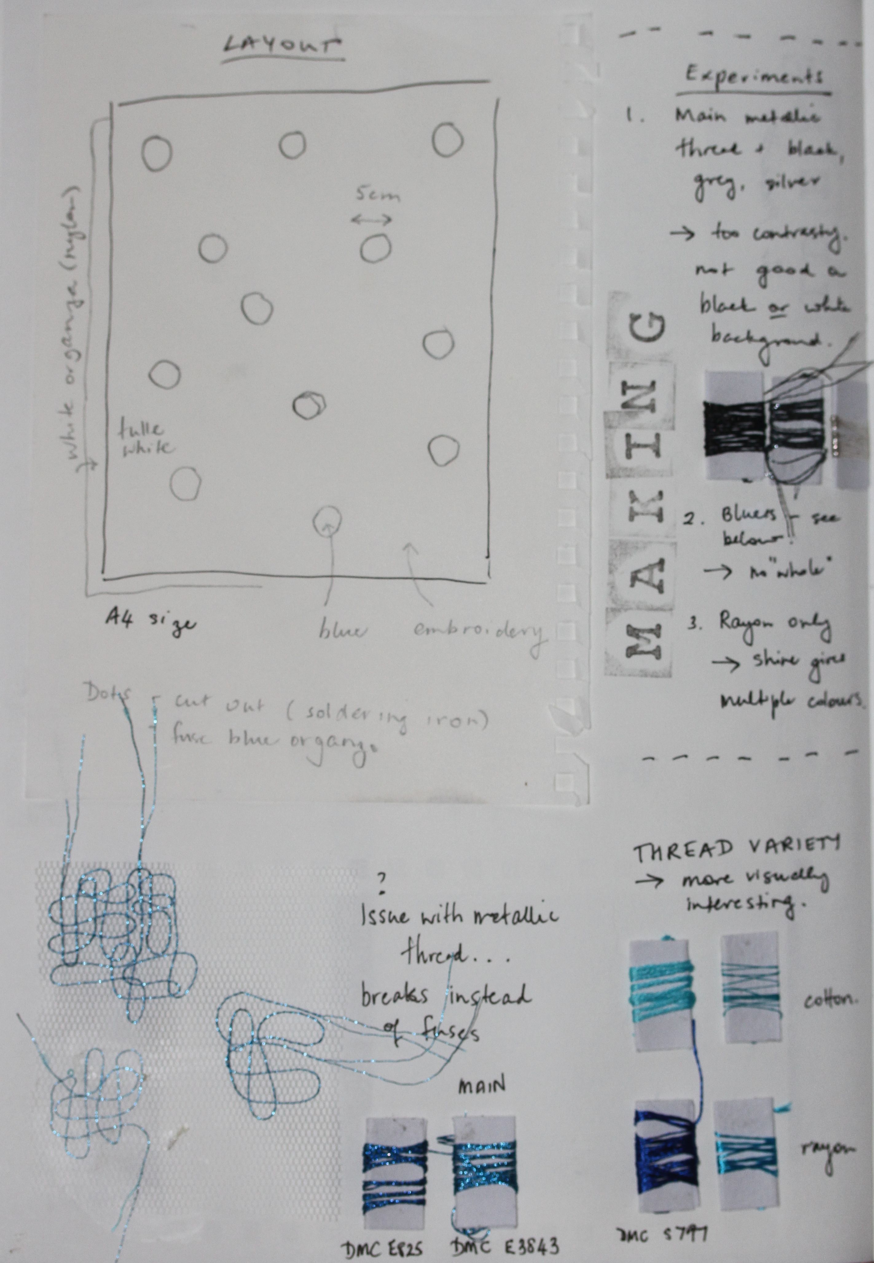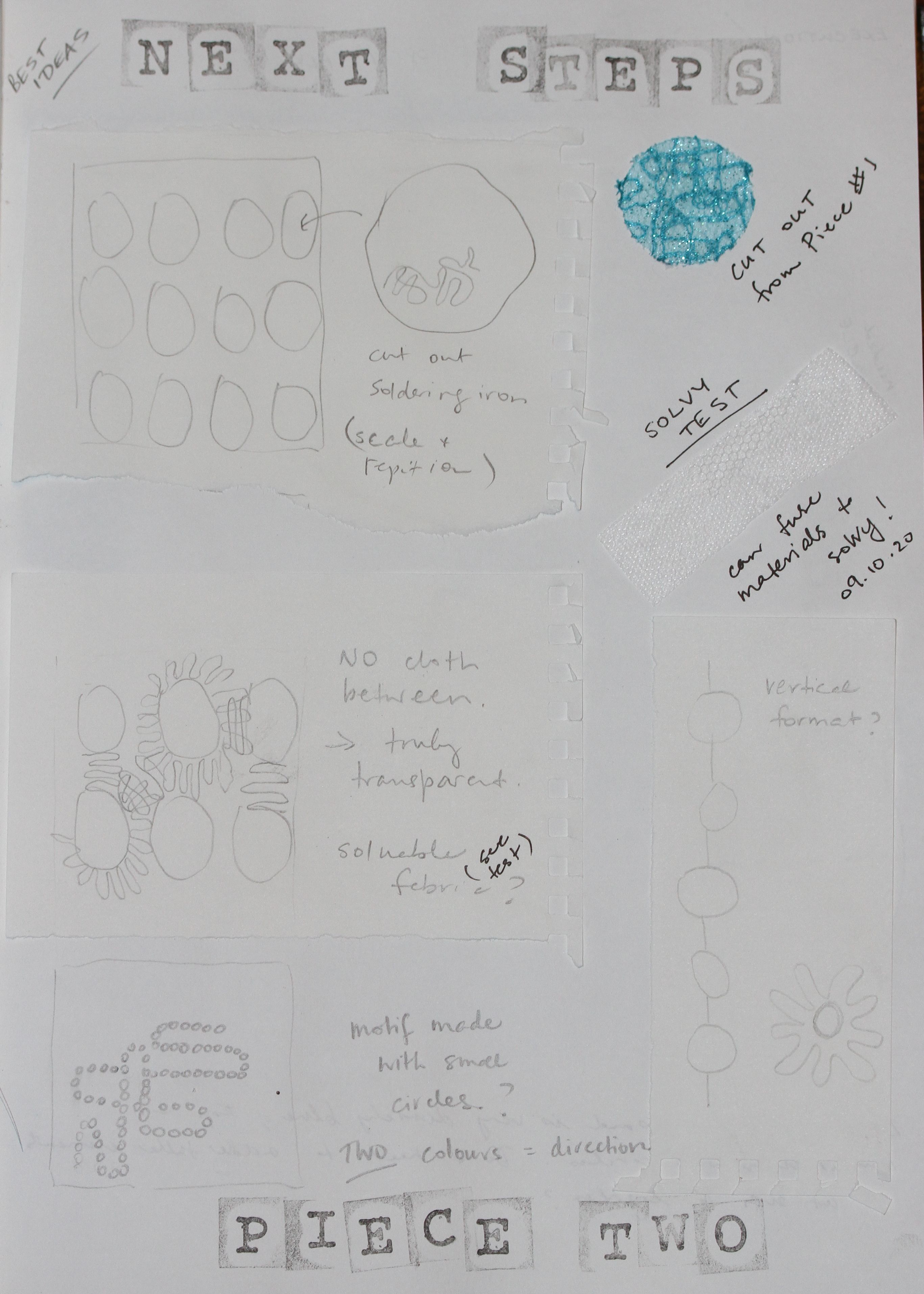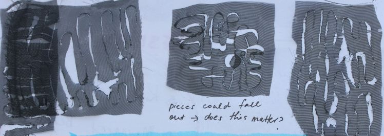 The main problem I encountered was that using the soldering iron to burn the stich motif into the organza resulted in overlapping lines creating small areas which fell out of the piece [centre sample in picture]. I considered burning the motif in one direction at a time, leaving ‘bridges’ to keep the fabric intact [left and right samples in picture].