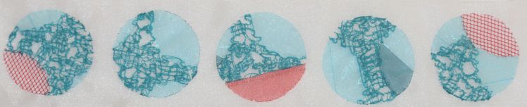 After making some small samples, it became apparent that I would require two pieces of ‘solvy’ to make a substrate that would feed through the sewing machine. The circles were pinned in place and machine stitching using my motif applied to the entire surface, going over it twice, crossing extensively to ensure stability, and just catching the circles.