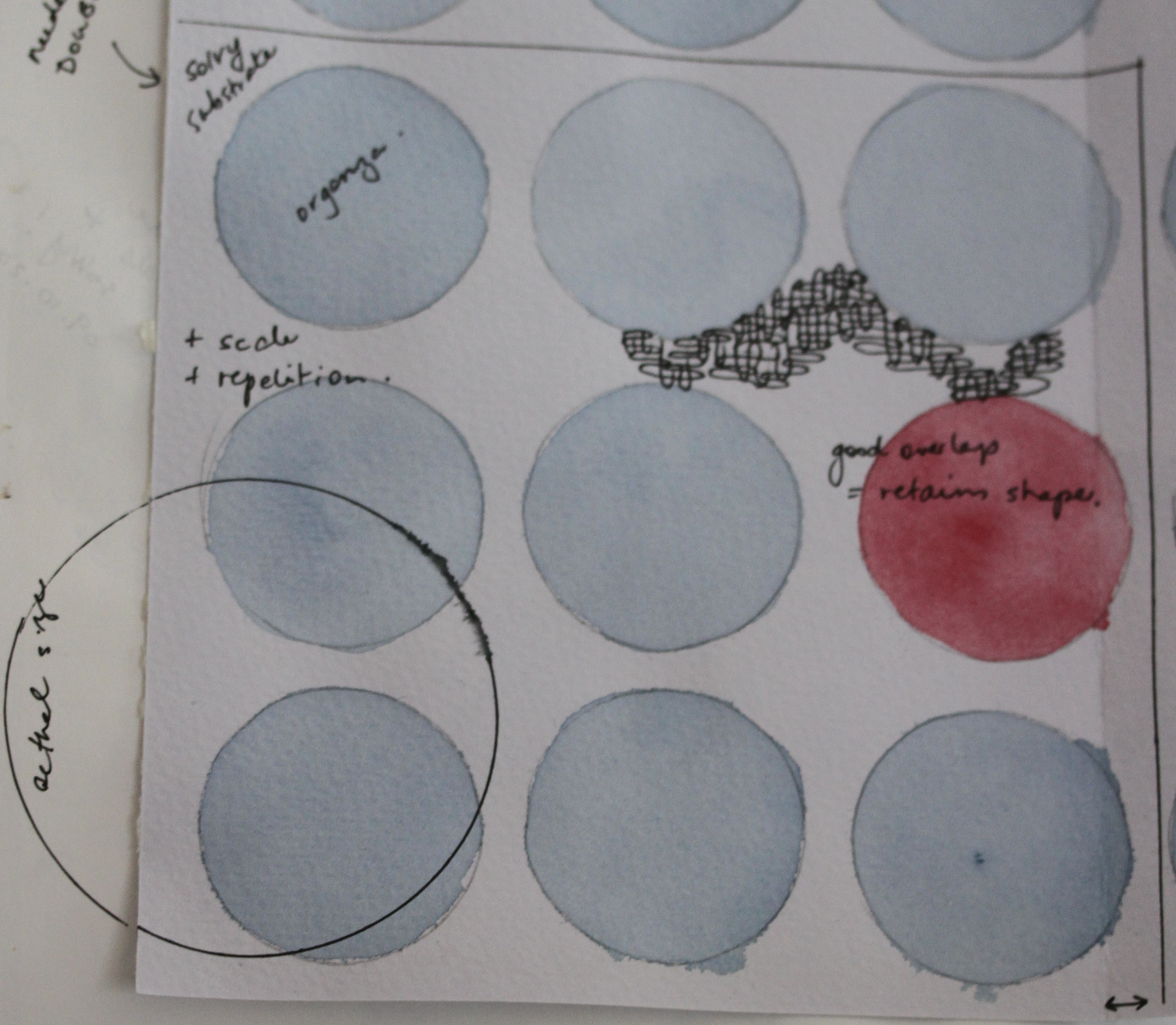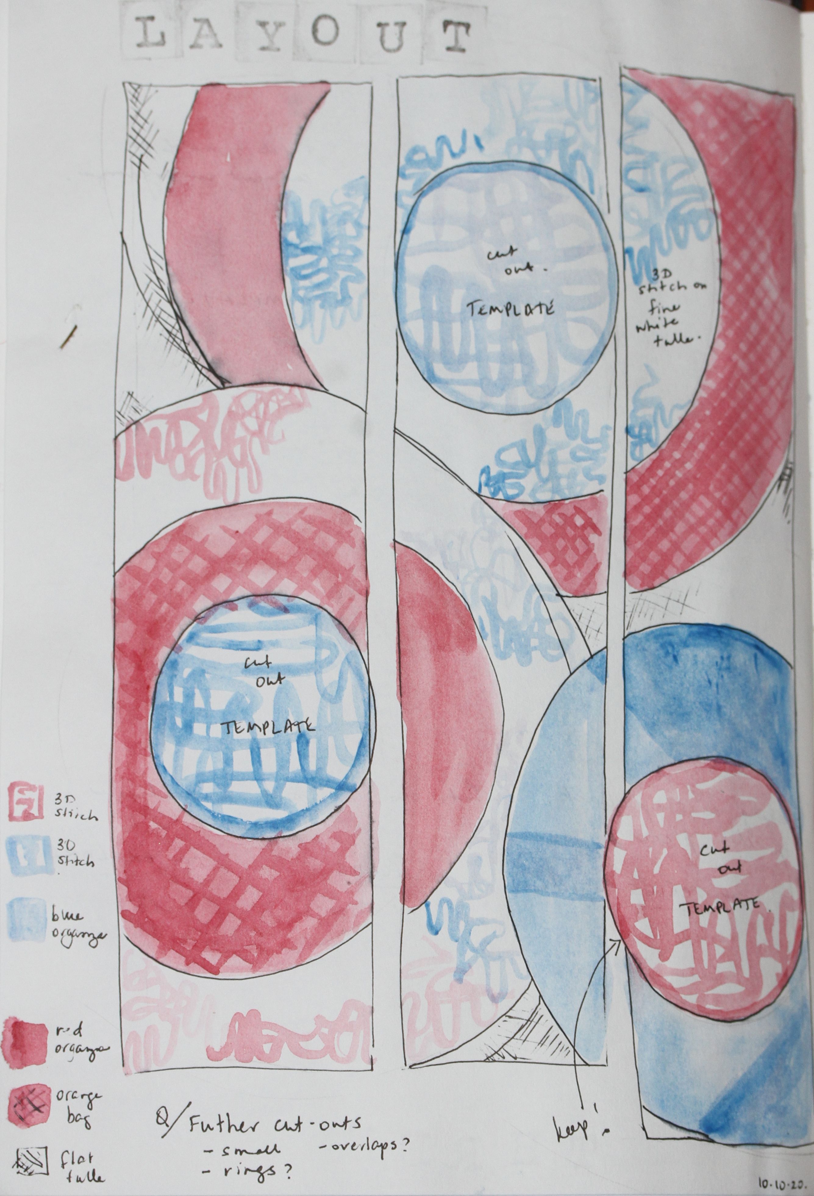 I drew a layout diagram for the addition of later cutouts in which teal-coloured organza circles would be inserted. The shape of the cut-outs was marked on the piece with the addition of small white organza circles. My surface was prepared.