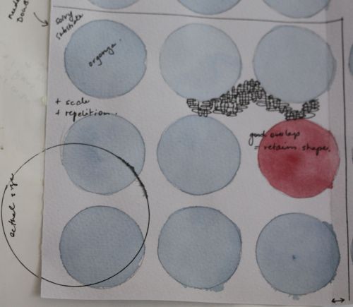 To make the template: I drafted a series of concentric circles using Adobe Illustrator and laminated the print-out to make a template similar to the one for the focal point design.