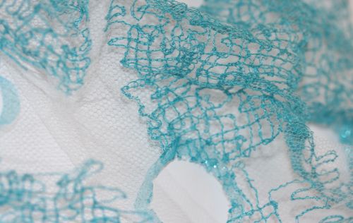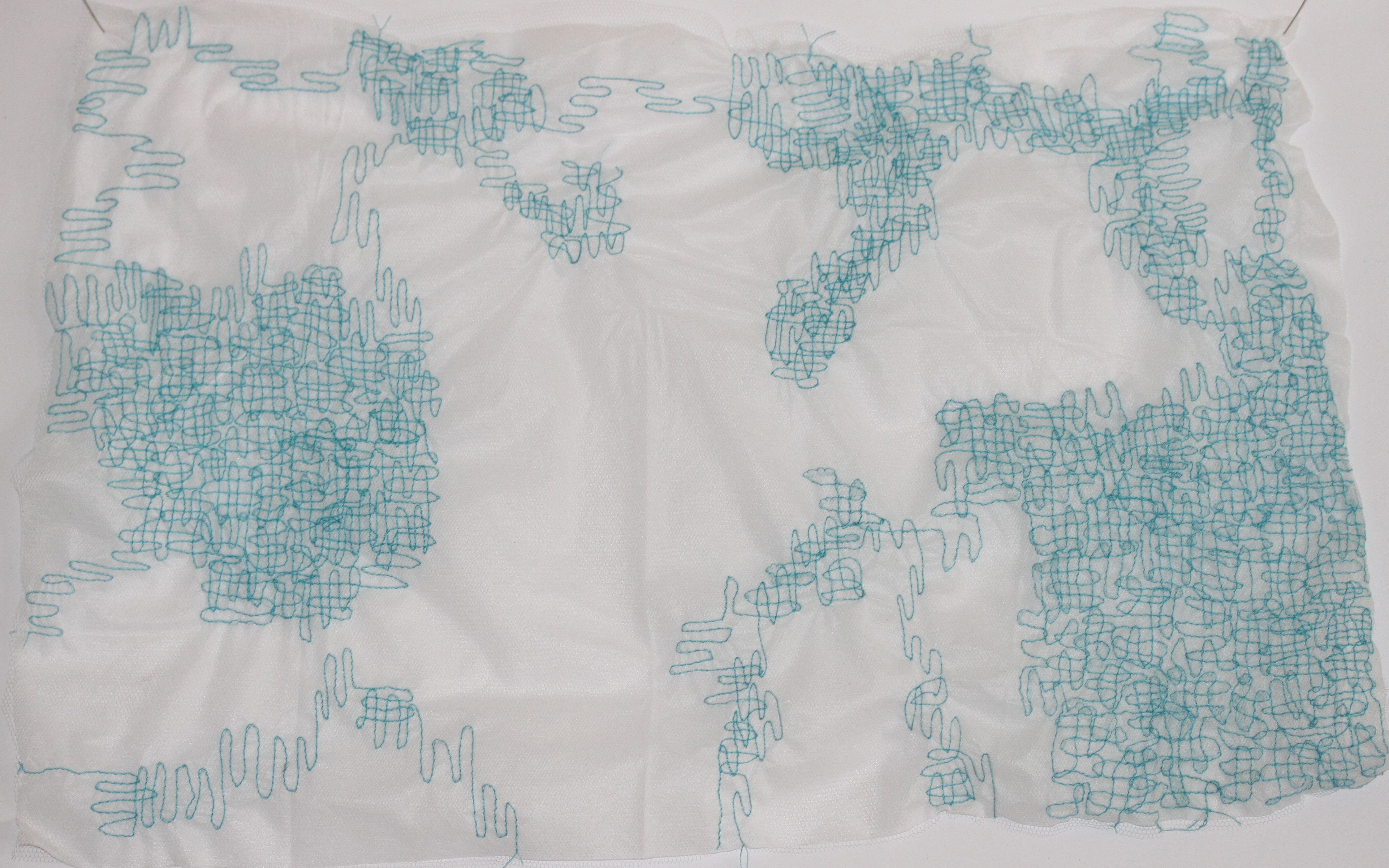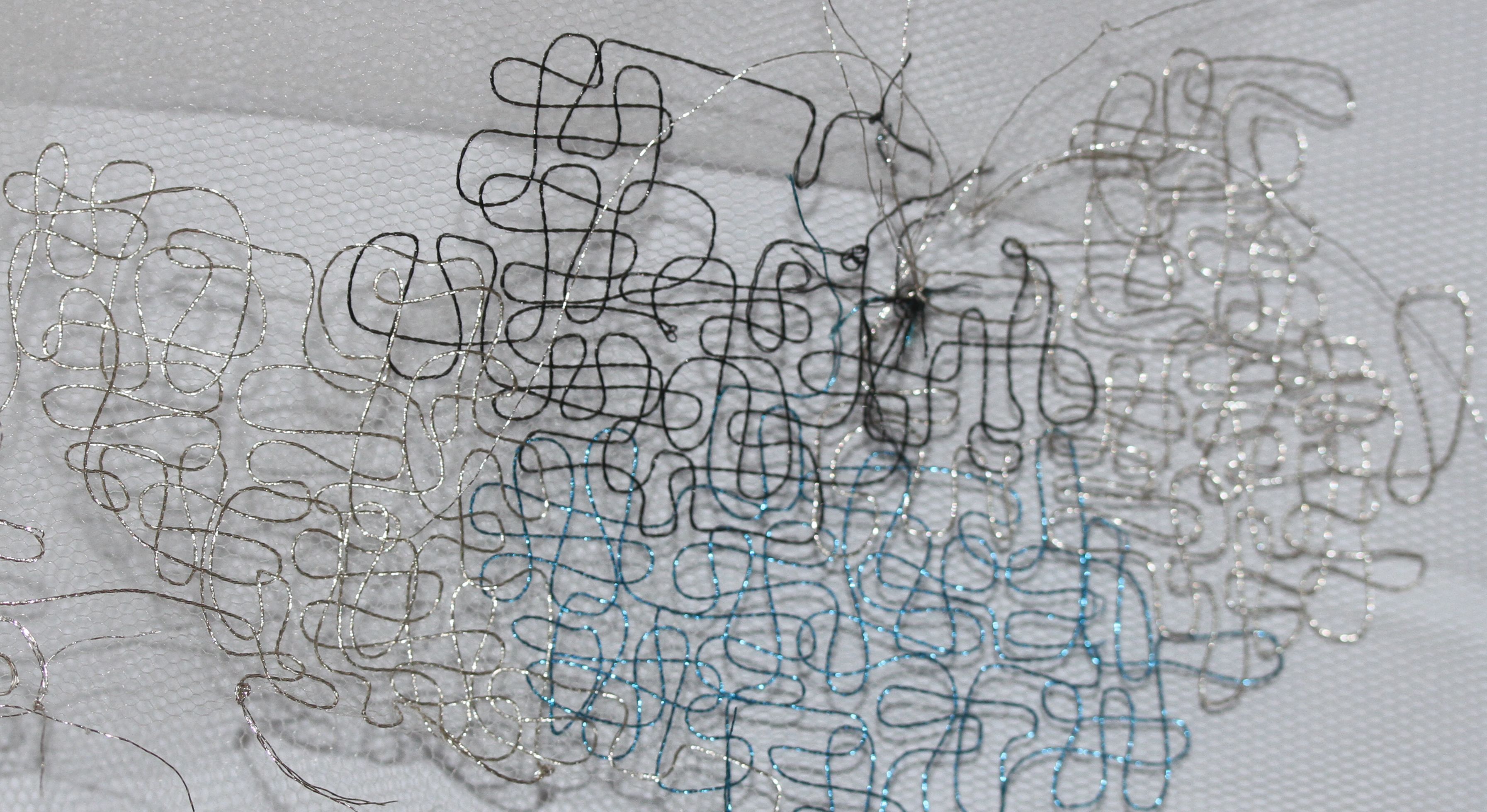 I had intended to fill the entire piece of tulle with the stitch motif; however, by chance I left the unfinished piece lying on the table when my bobbin required re-filling. Looking at the piece from a grater distance, it became obvious that the white space yet to be filled looked great, and that entirely covering the tulle would not be as visually interesting. I had made a note to myself to consider white space more frequently when I examined Roanna Wells’ work.