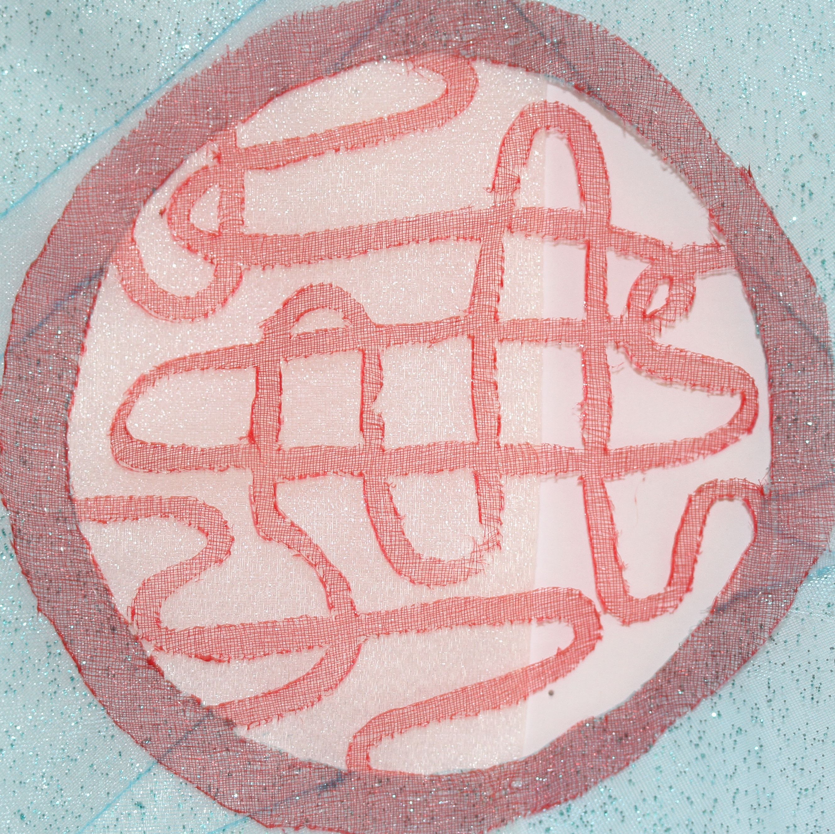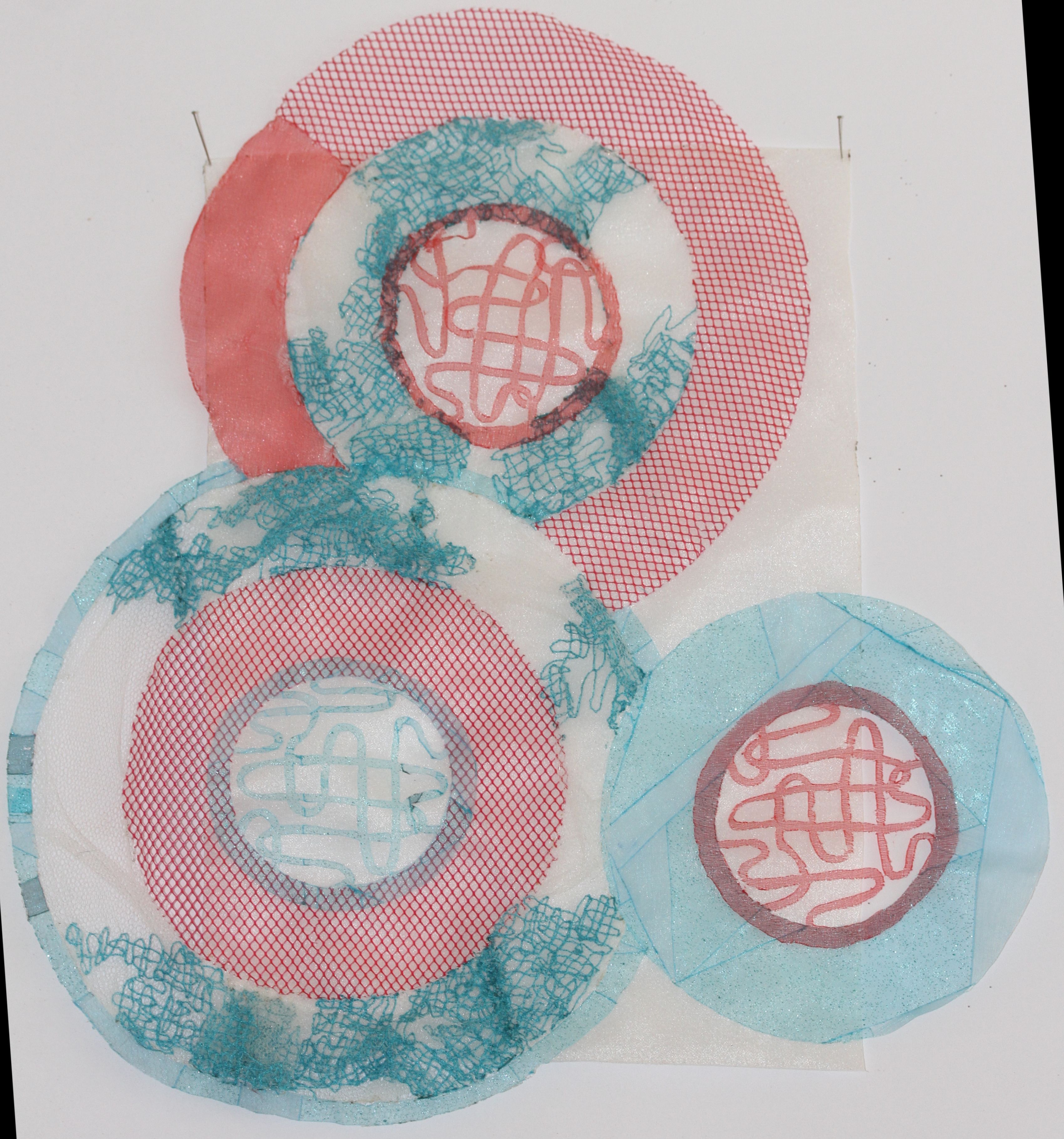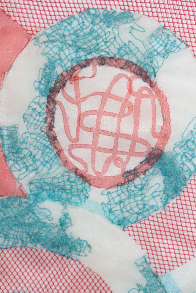 I wanted to emulate the stitching motif used on Piece #1, but use it to link the coloured circles, so that there was not cloth, not even tulle, between them. This would be transparent and ‘floating’ in the purest sense.