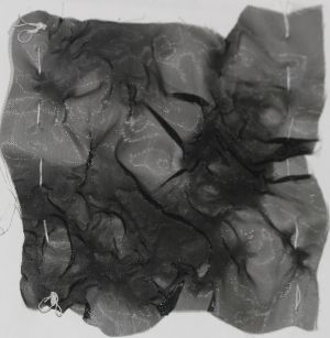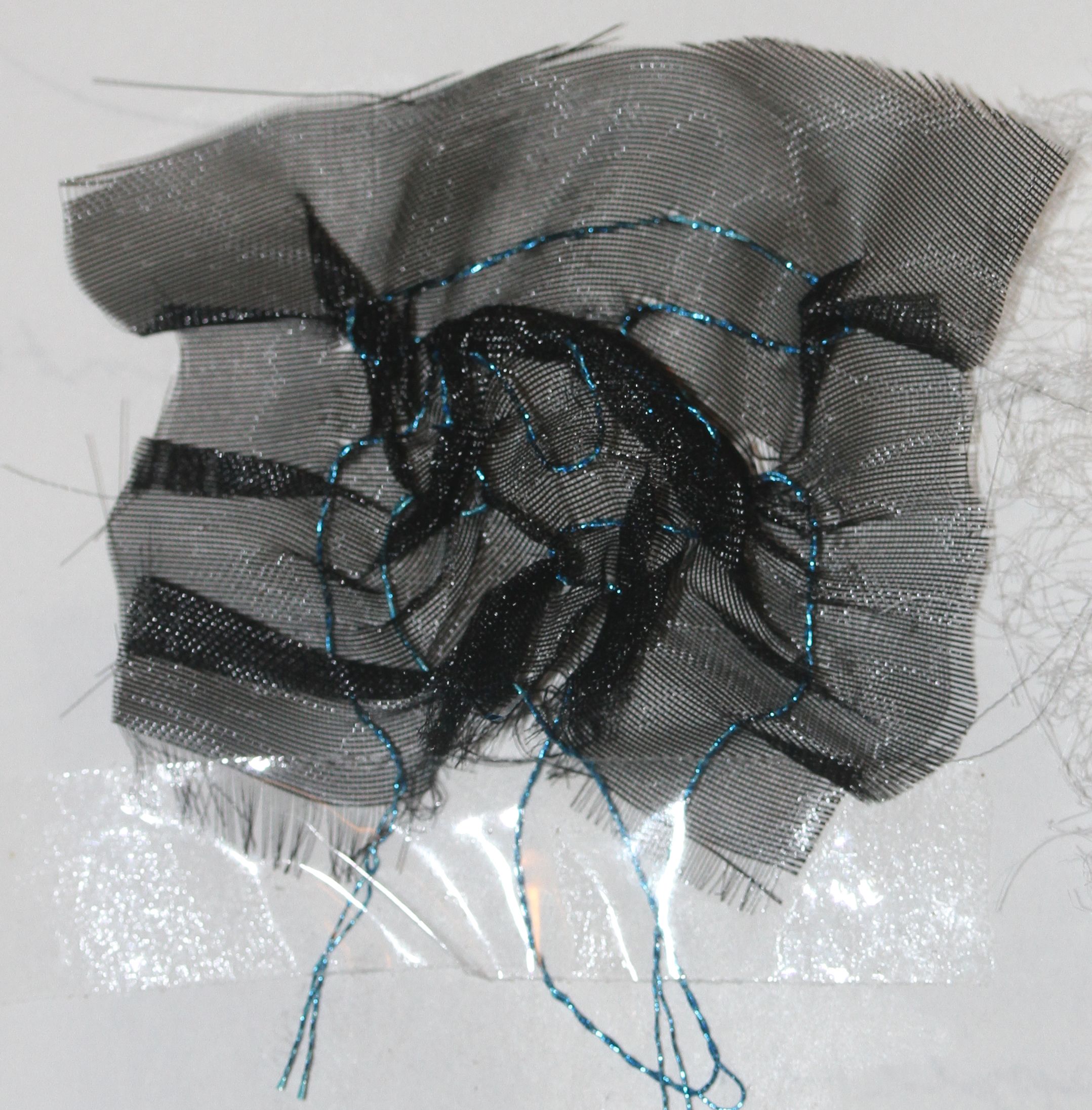 2. Gathered lightweight tulle, could provide even more three-dimensional volume than the heat treated samples, so this was my final choice. A a piece of lightweight tulle twice the width and height of my final piece was gathered at the edges and sewn to a piece of stiffer, heavier tulle cut to approximately A4 size. The stiffer tulle lay flat, while the finer tulle was able to crinkle and mold into hills and valleys.