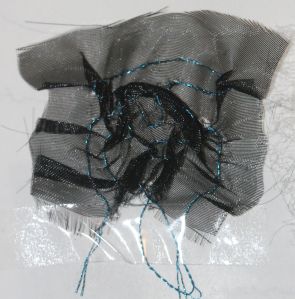 Choosing Threads (link to sketchbook page). My initial samples employed the teal metallic thread used in the plastic prompt sample, as this was the origin of the curving stitch motif. I then introduced black, silver and grey metallic threads to assess the look of these.