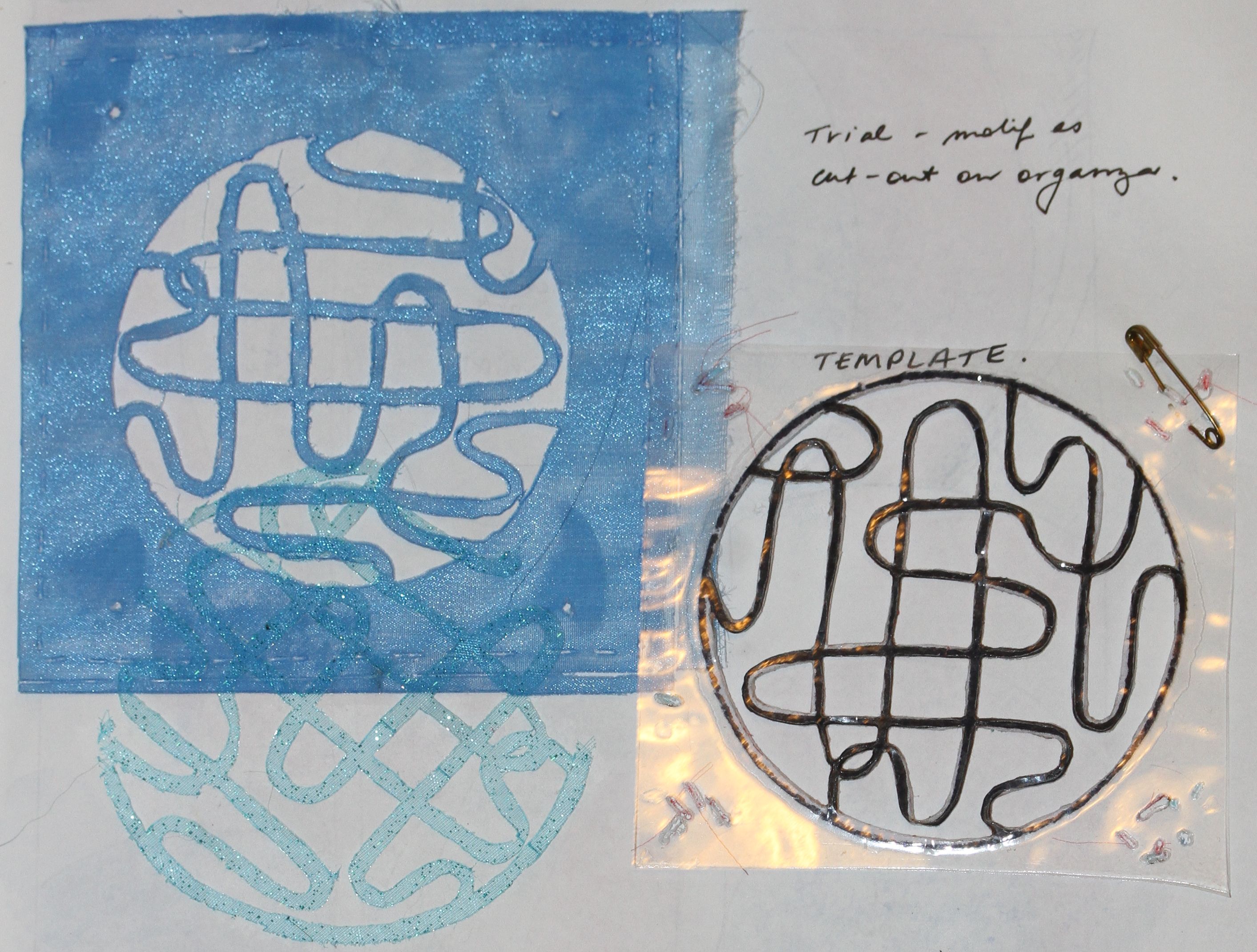 I realised that I could ‘cut around’ the stitch motif, rather than reproduce the crossing of lines. Obvious in retrospect. I worked up the design, so that it could be cut with a soldering iron from organza: