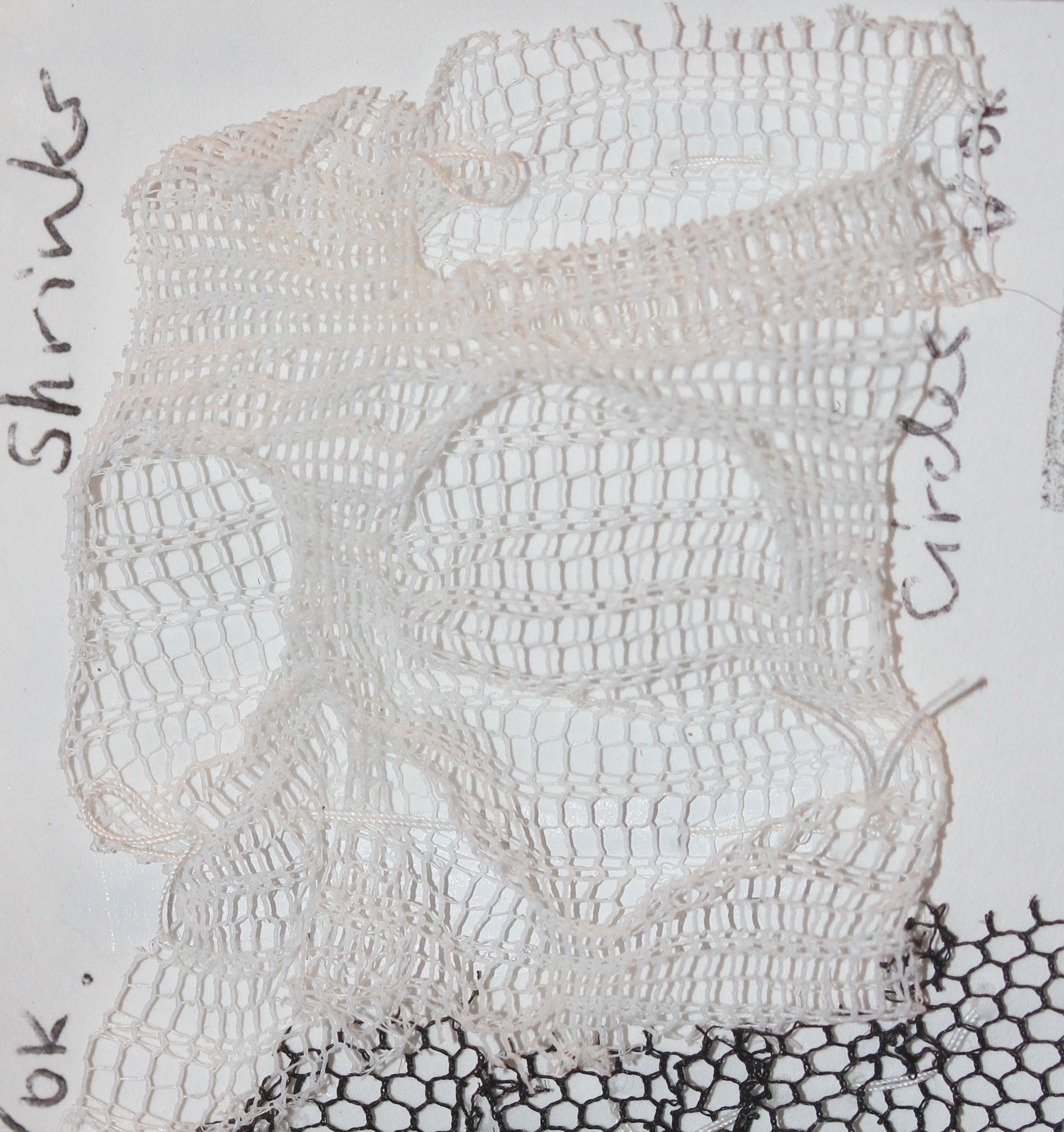 1. The finest tulle and the netted curtaining melted into circular patterns, whereas the coarser tulle and the knitted tended to tear and burn rather than melt. The synthetic organza also gave the required texture under the heat of the gun.