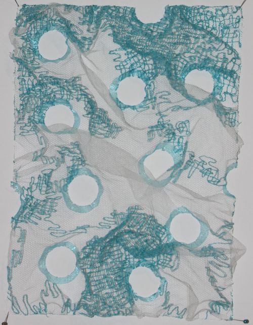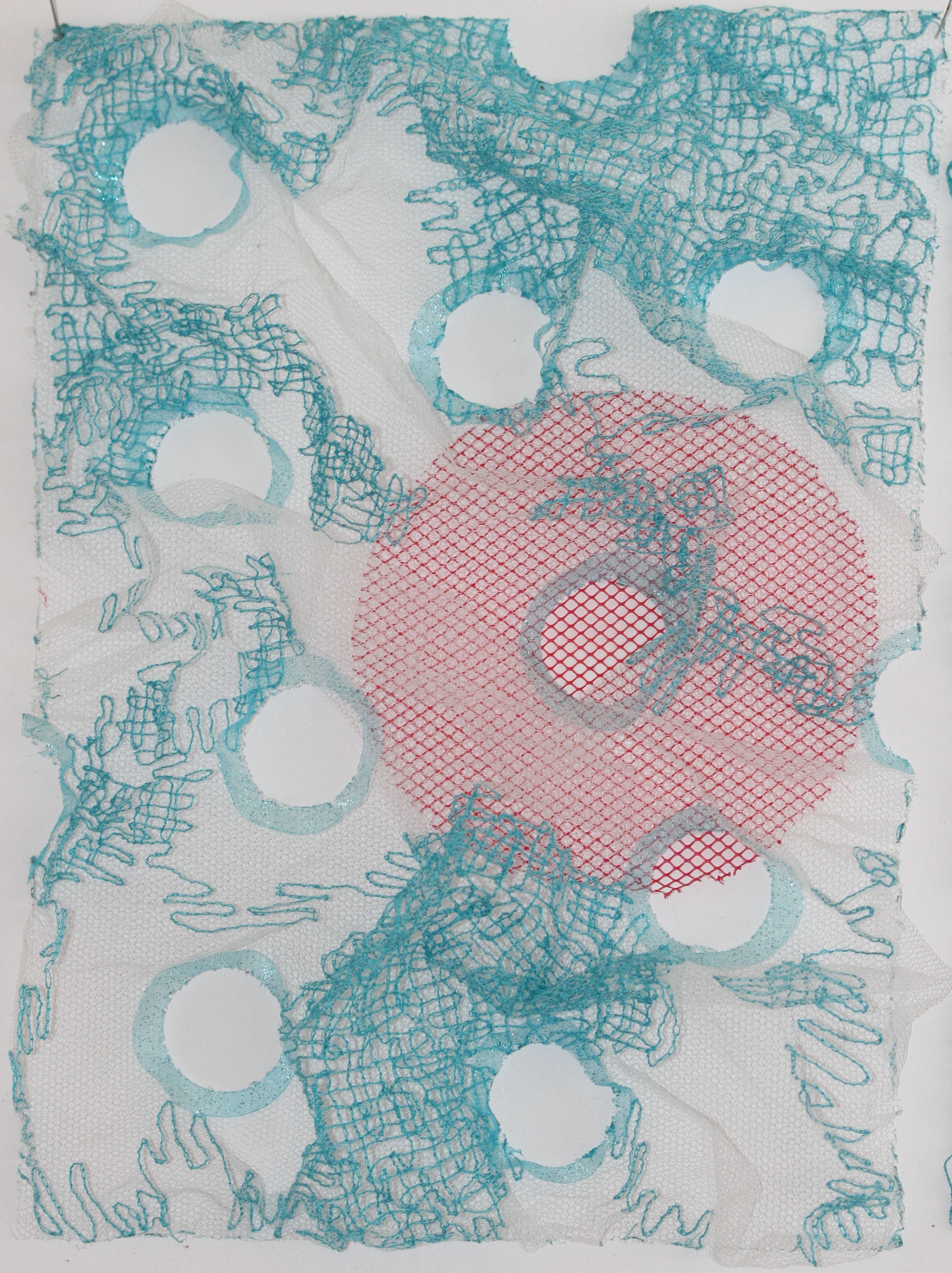 My exposure to Margaret Beal’s work taught me how to cut the holes in the work, resulting in fusing the two layers together and giving a finished edge; this would be the method employed to create holes through both layers of tulle and stitching.