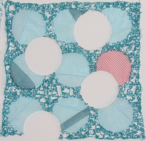 I added a new colour to this piece. By chance, my teal organza was resting next to the red bottle cap used as a template for the circles in Piece #1. I liked the combination.