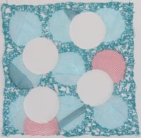 The base textile this time would be a series of teal organza circles (7.5cm diameter), cut from a wide wired ribbon and other scraps, set in a a 3 x 3 grid, creating an approximately 27cm square. My layout/design: