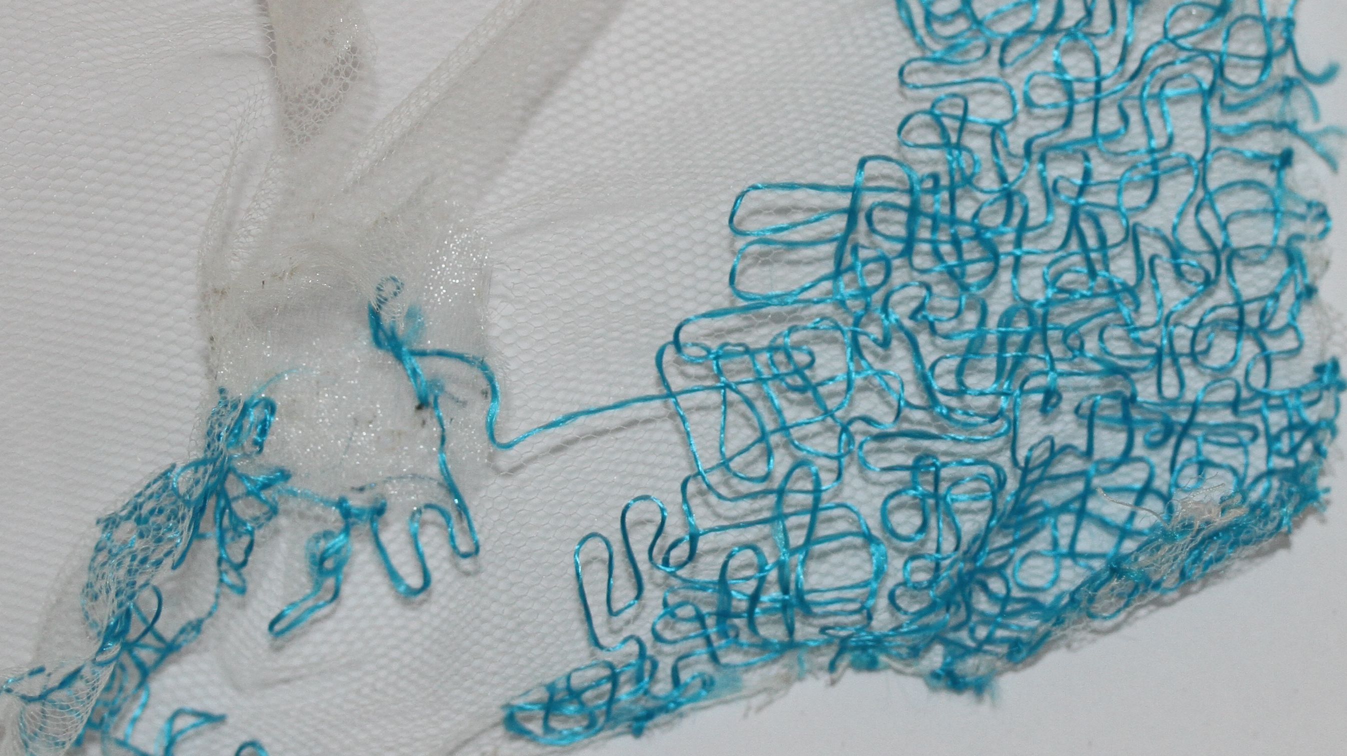 After several weeks of hand-stitching samples and my initial piece, I realised that the time commitment I had just taken on was untenable. Although I was incredibly pleased with the appearance of the piece, I resolved to machine stitch the tulle with a teal polyester (chosen so I could cut it with the soldering iron later) dressmaking weight thread.