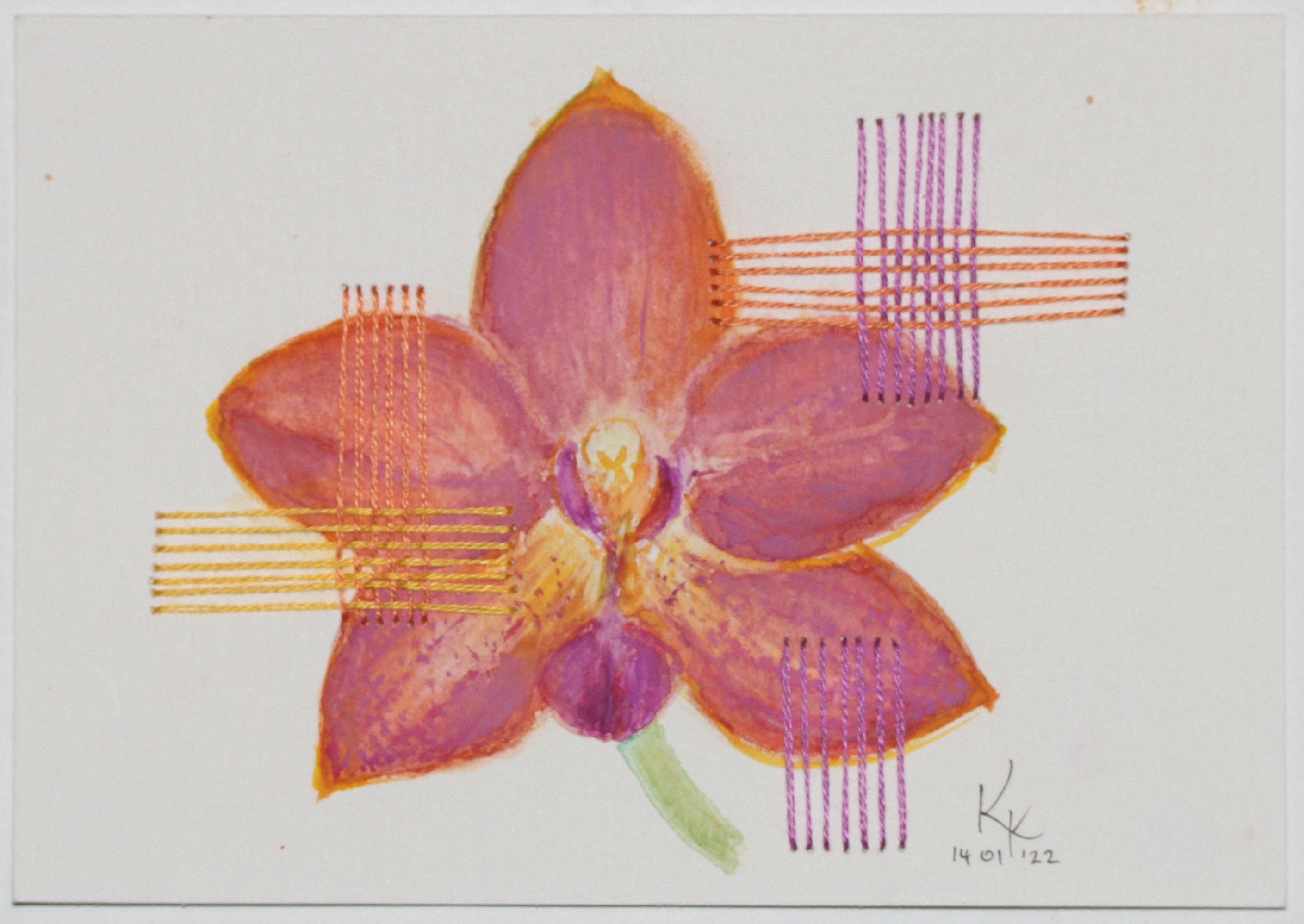 Painting the orchid has been fascinating over the last week. Careful observation reveals that its amazing copper colour is due to the interaction of yellow petals with ‘orchid’ purple.