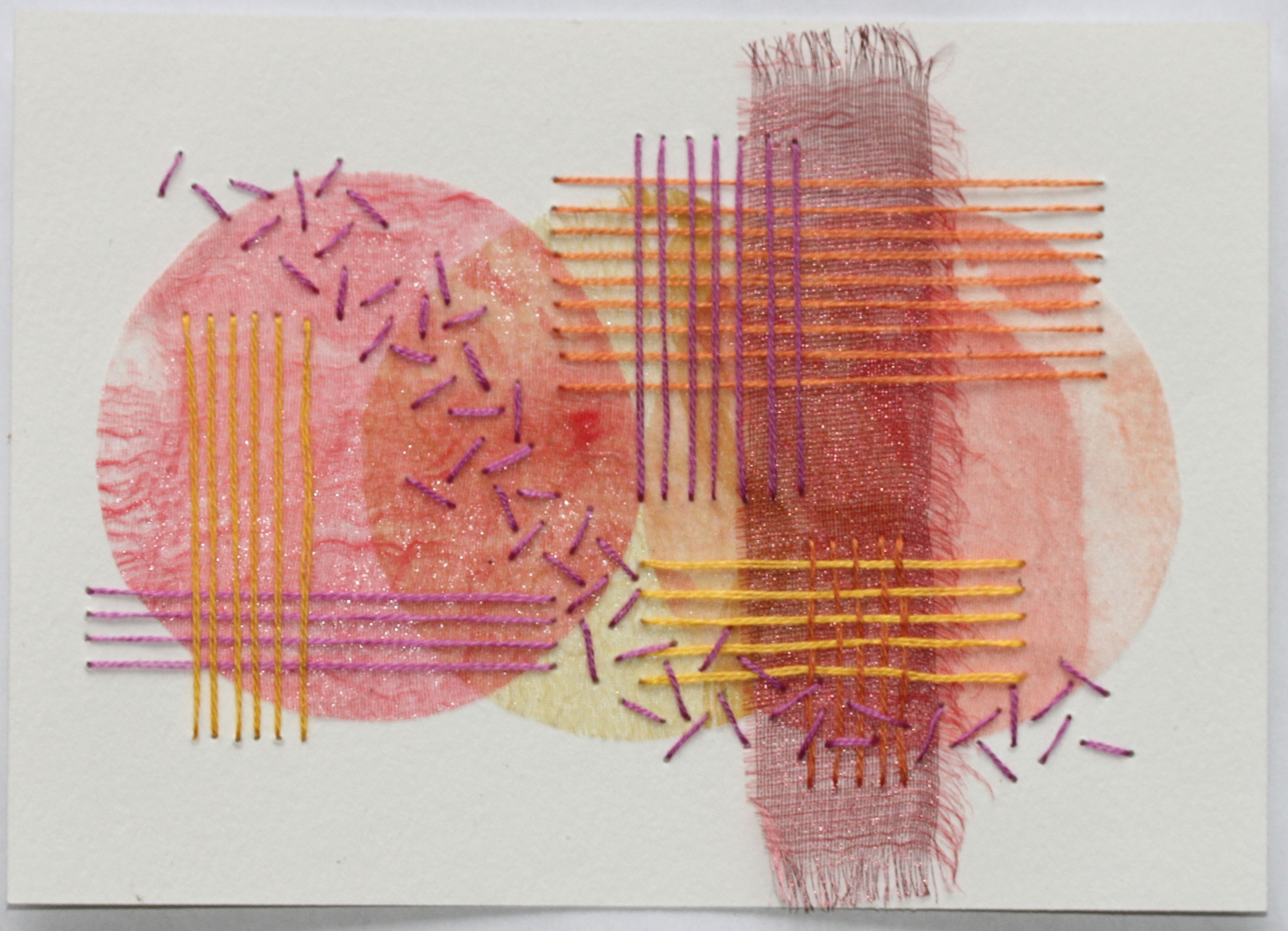 Directly following from yesterday’s painting. This time, completely abstracted, the lobes of the orchid are circles (hand-painted silk organza), the lines on the petals are seed stitch. The palette is identical.