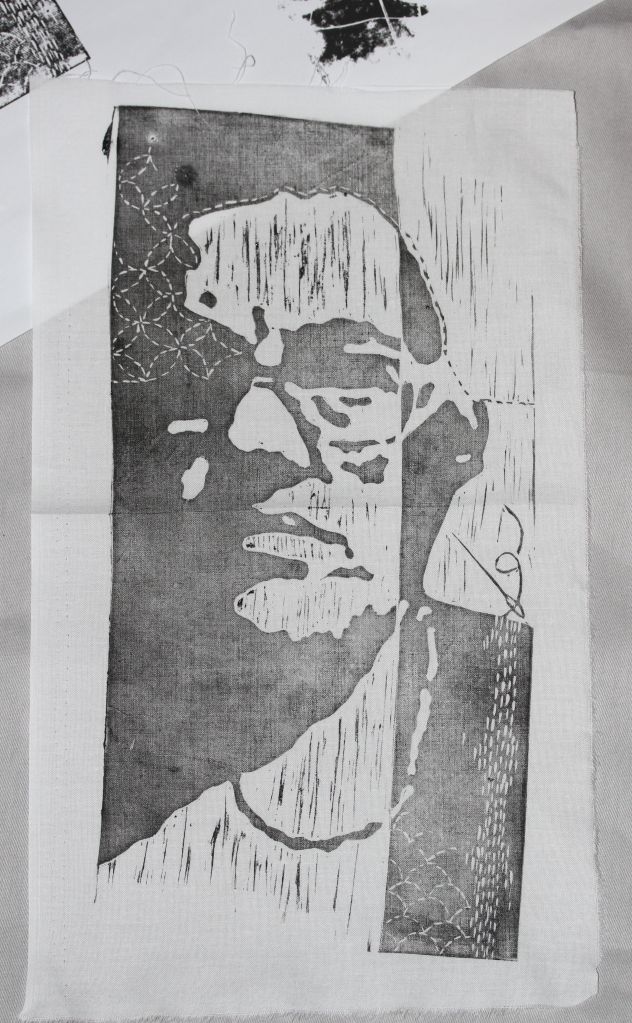 Capricornia Printmakers recently participated in Print Day in May. Our theme was ‘Abstraction of Self’, and you can see my lino print above, a rather serious photo taken via my laptop and converted into a block.
