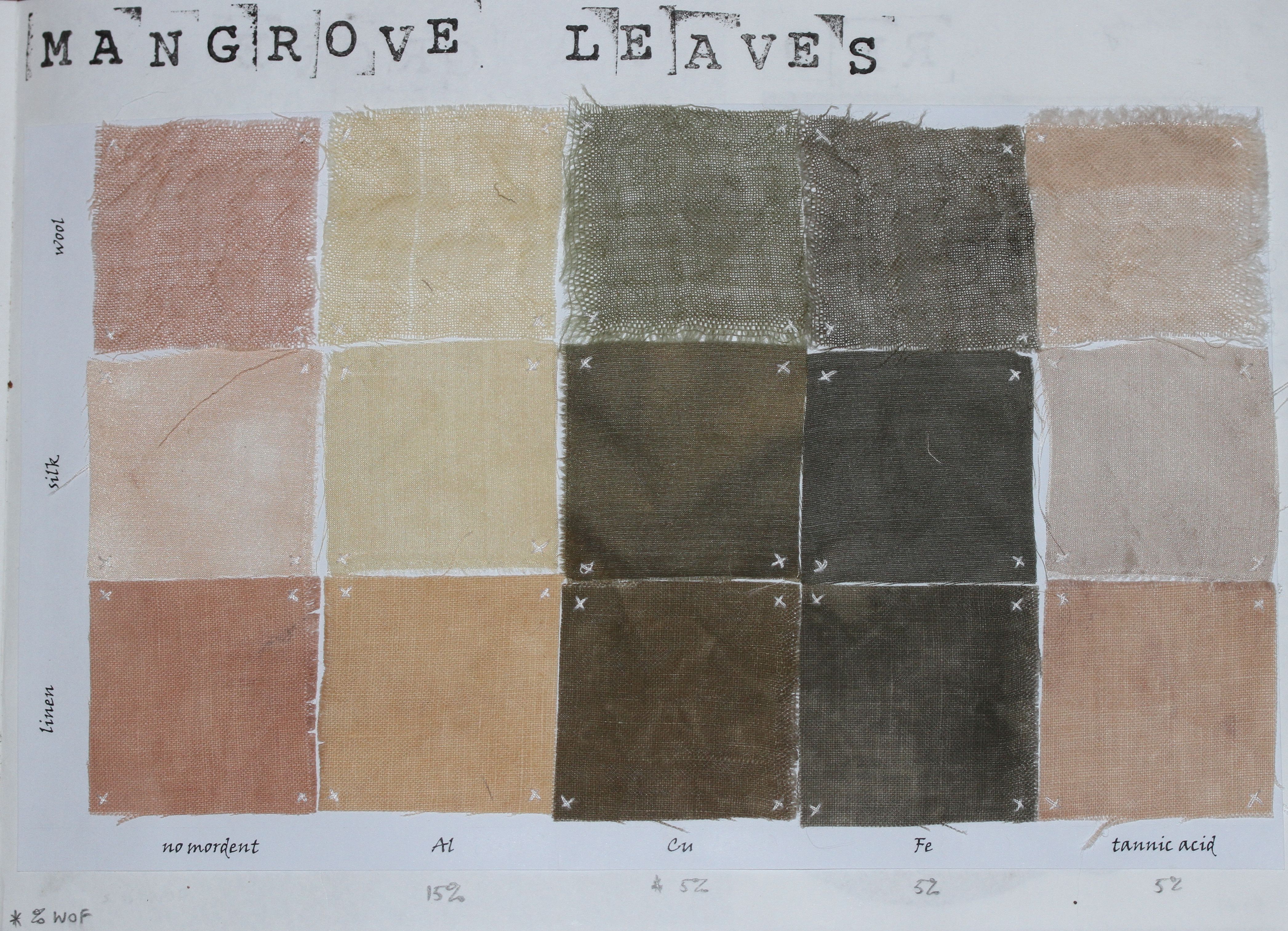 I collected the bright orange leaves discarded by red mangroves and washed up on the beach. I then dyed various fabrics: silk, linen, cotton, wool with the extract using different mordants. The colours are entirely produced from the mangrove leaves.