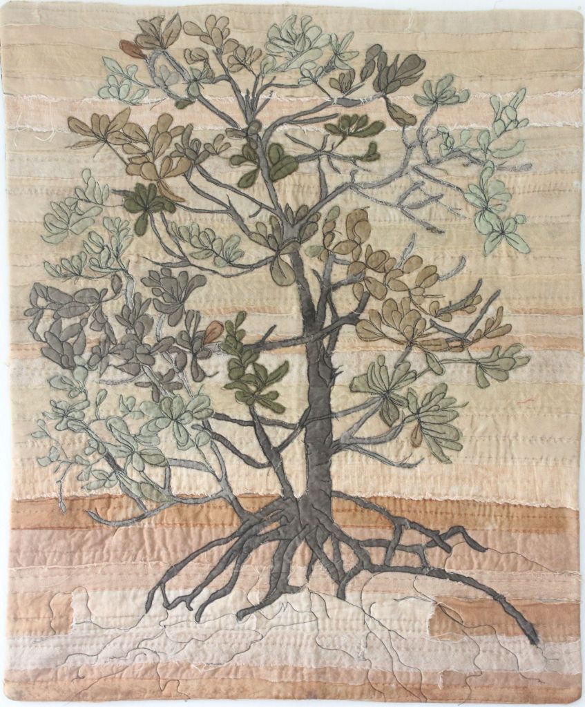 After laying down and quilting the background, I appliqued the mangrove tree from a drawing I made on the beach: