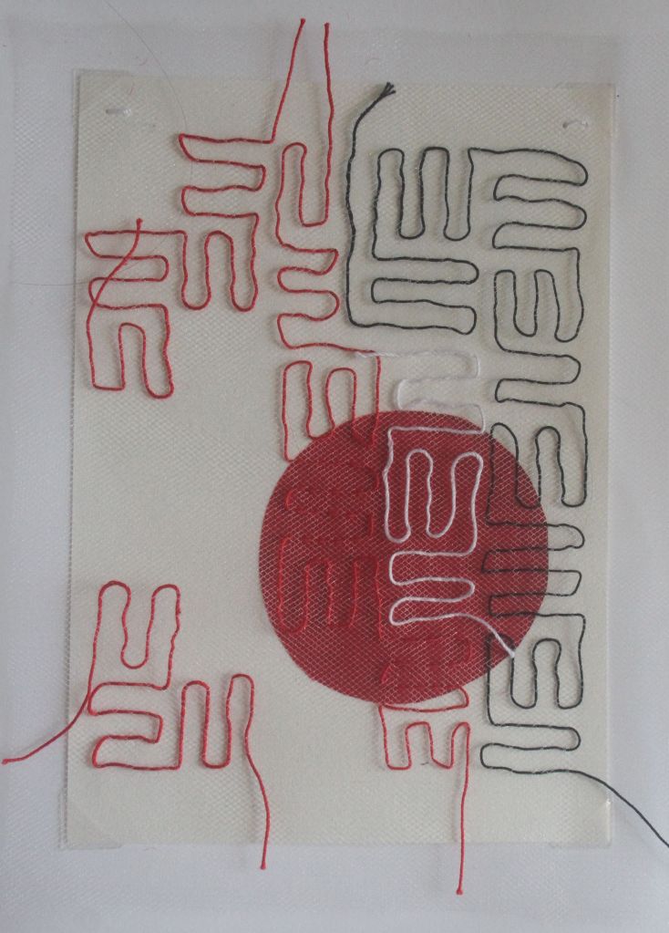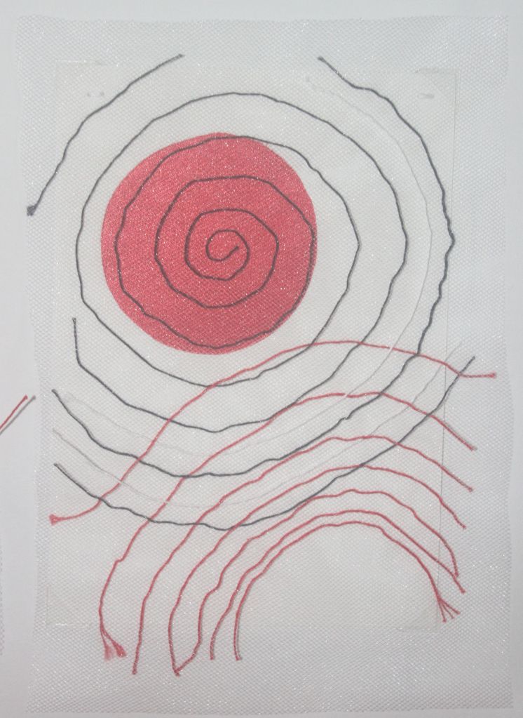 I’m doing it in conjunction with Lisa Call’s Sketchbook Challenge. My rules this time are spending just 15 minutes a day continuing a small series I started in 2022 using stitching on tulle over red satin circles. I’ve restricted myself to postcard size objects again, and I’m using white bridal tulle and red, black and white crochet cotton again.