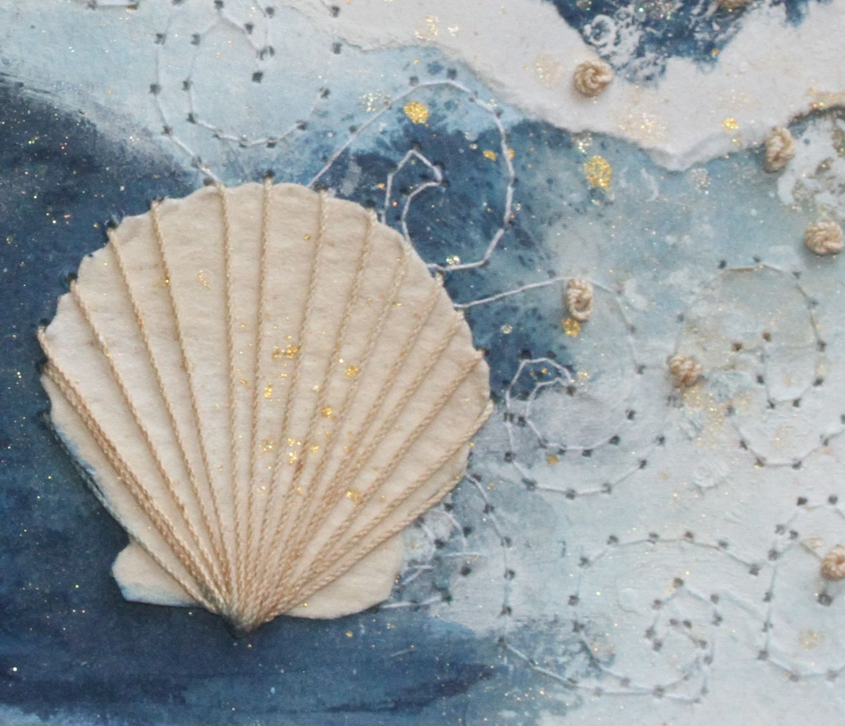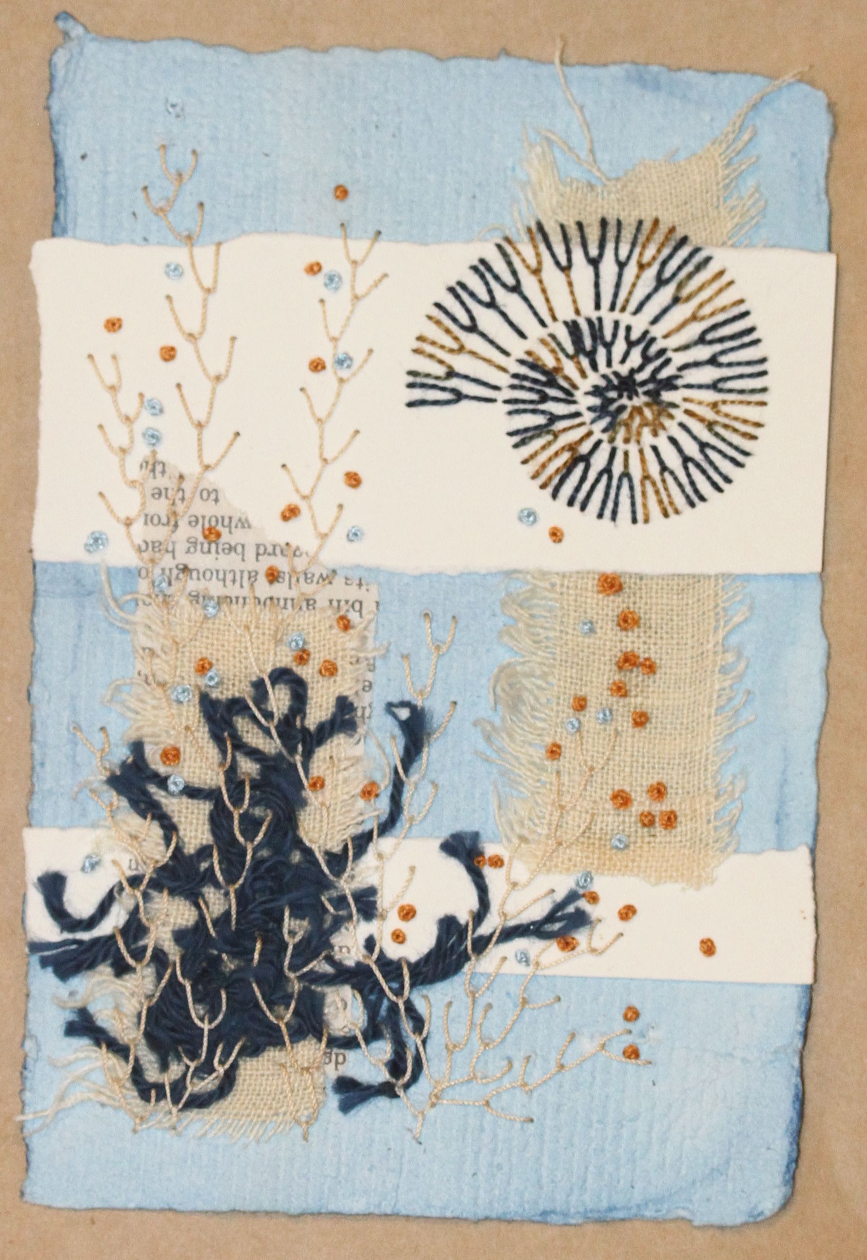 Make a paper postcard using embroidery stitches to render life-like corals, shells and sea weed. We will focus on simple feather stitch coral and a collaged scallop or feather stitched nautilus during our time together; but, you will leave with your head spinning with ideas for other projects!