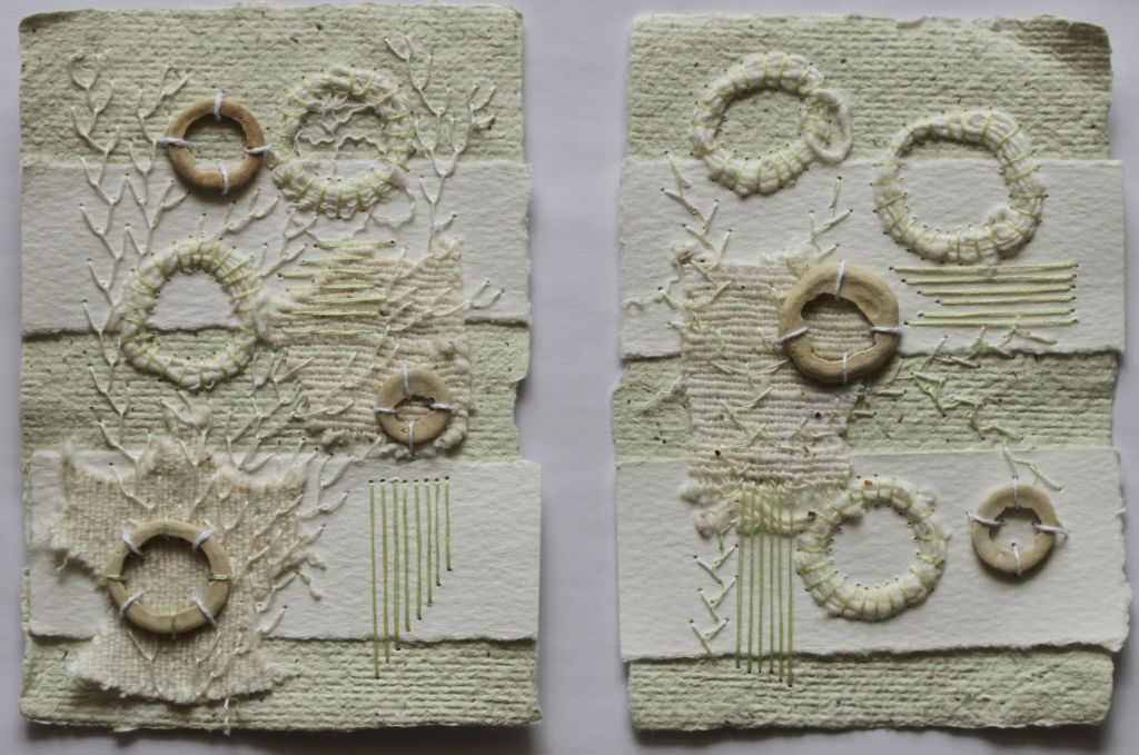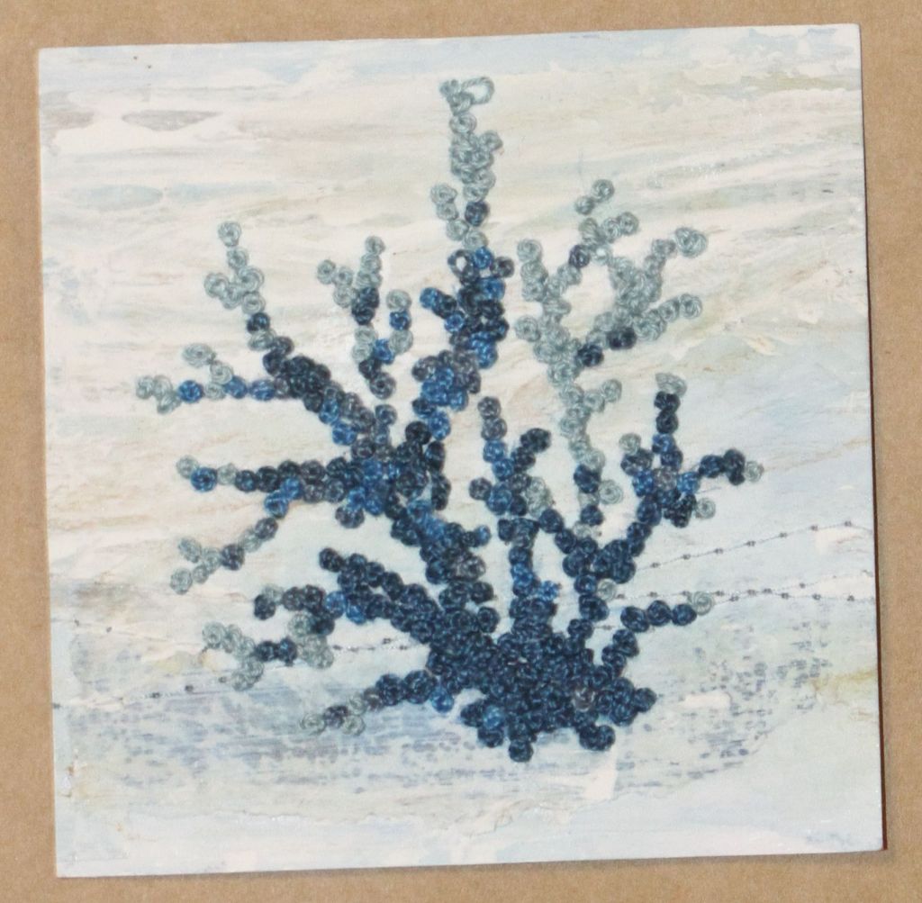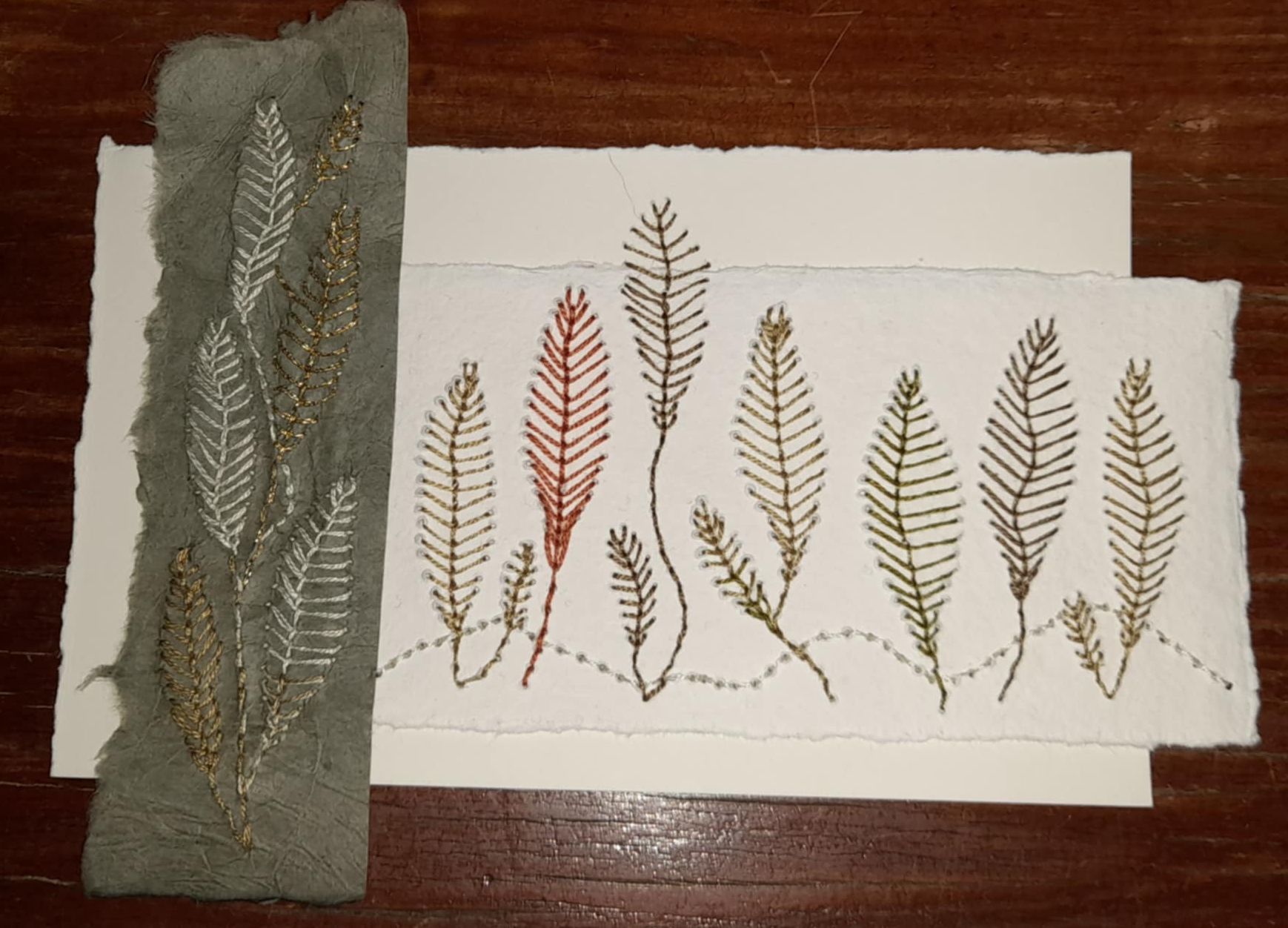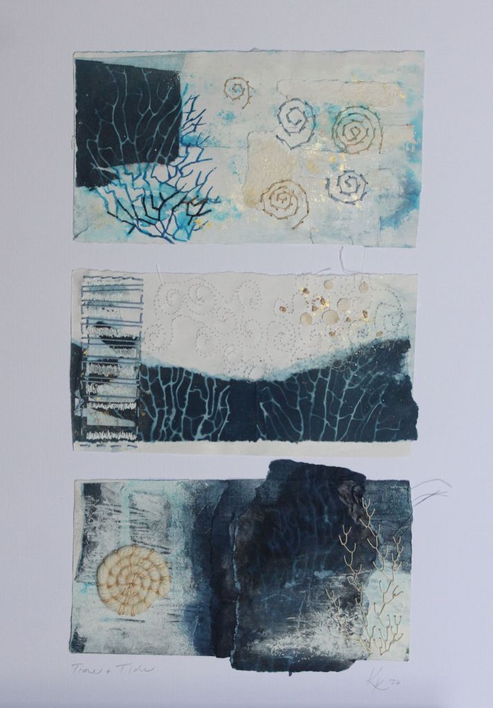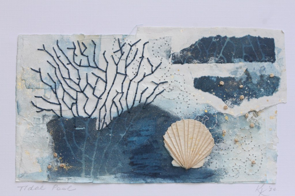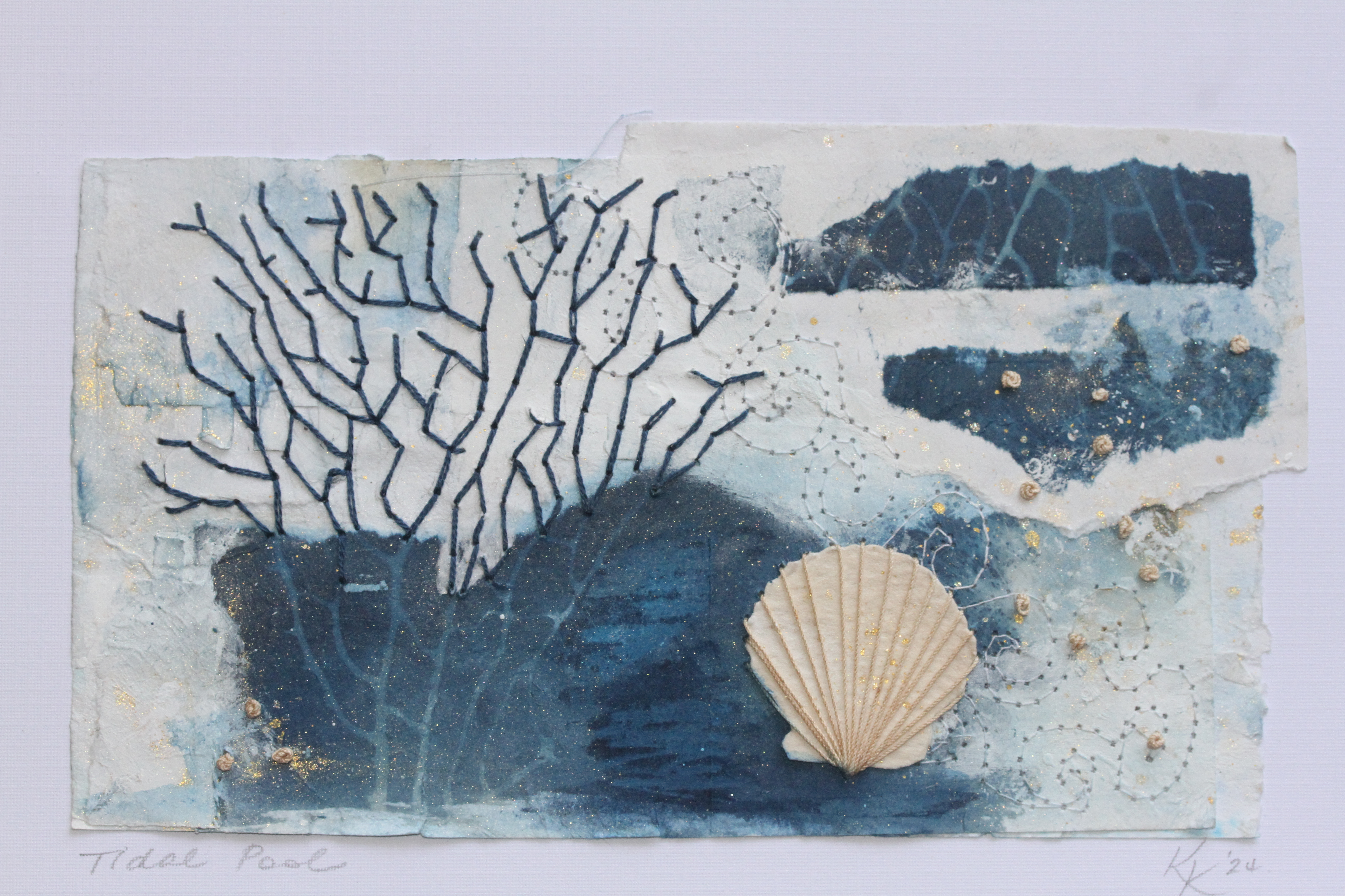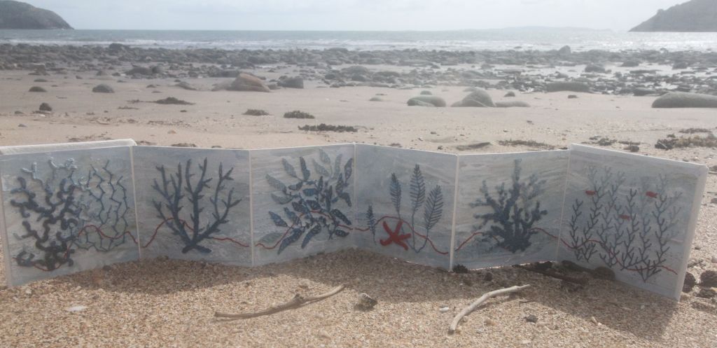 Skeletons and Ghosts Tidal Pool Sand Dollars Ferny Fronds, 2025 Cyanotype captures ghostly images of coral skeletons, ghosts and skeletons left on our beach, and by the changing climate. Time and Tide, 2024 Artist’s Book, Postcards from the Sea, 2025. Close up photos.